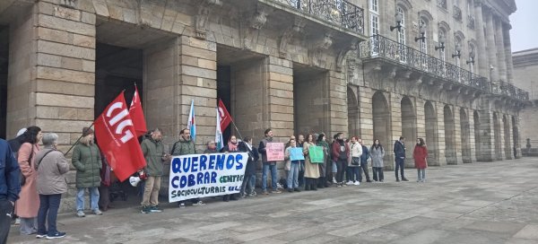 As traballadoras e traballadores da rede de centros socioculturais de Santiago de Compostela concentráronse estes xoves diante do Pazo de Raxoi para demandar respostas e solucións inminentes ante a complexa situación laboral e económica na que se atopan, tras permanecer sen cobrar dende o mes de outubro e a decisión de suspender as actividades. Na protesta, que coincidiu coa celebración do pleno municipal, reclamouse tamén información concreta sobre o futuro do servizo .