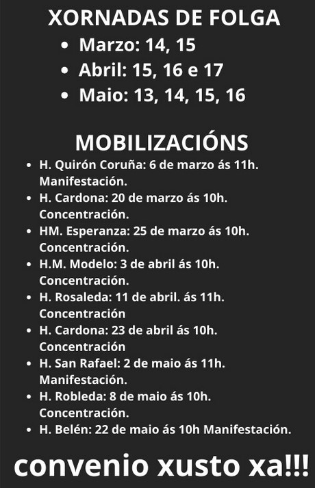 O calendario de concentracións arrinca mañá mércores, día 6 de marzo, cunha manifestación, ás 11:00 horas, desde o Hospital Quirón da Coruña. A partir de aí están previstas concentracións o 20 de marzo no Juan Cardona de Ferrol, ás 10:00 h; o 25 de marzo no HM Esperanza de Santiago, tamén ás 10:00 horas; o 3 de abril, á mesma hora no HM Modelo; o 11 de abril, ás 11:00 h na Rosaleda; o 23 de abril, as 10:00 h novamente no Cardona; o 2 de maio as 11:00 horas, manifestación desde o Hospital San Rafael; o 8 de maio ás 10:00 horas, na Robleda e tamén manifestación, o 22 de maio, ás 10:00 horas, no Hospital Belén.