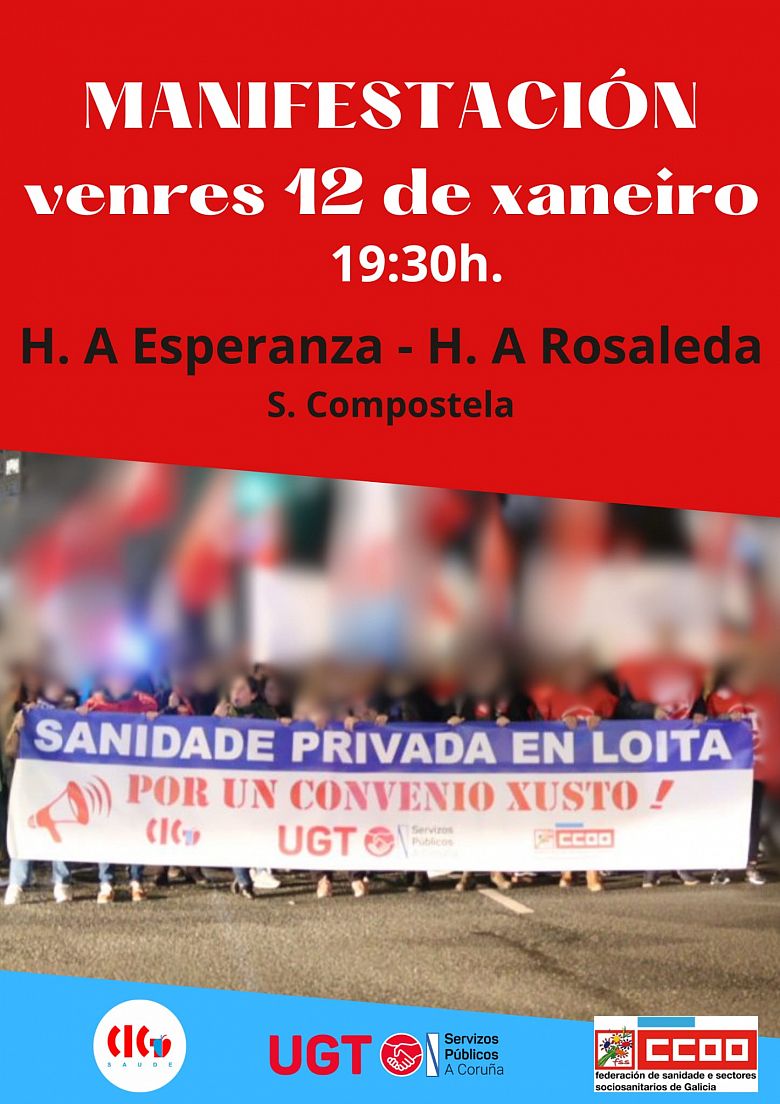 Representantes da CIG, CCOO e UGT na sanidade privada compareceron este xoves en rolda de prensa para anunciar a convocatoria dunha nova manifestación o venres, día 12 de xaneiro, ás 19:30 horas, con saída diante do Hospital da Esperanza e remate no hospital da Rosaleda. Desde os sindicatos fixeron un chamamento a mobilizarse tanto ao persoal como a cidadanía para que apoie as súas demandas.