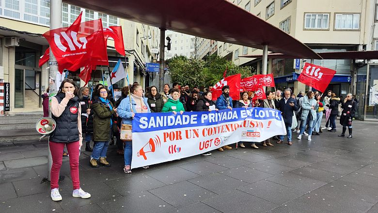 As traballadoras e traballadores da sanidade privada da provincia da Coruña están secundando este xoves de xeito masivo a cuarta xornada de folga para reclamar un convenio digno. Para dar máis visibilidade á súa loita, o persoal mobilizouse pola mañá en Compostela e realizou unha manifestación pola tarde na cidade da Coruña.