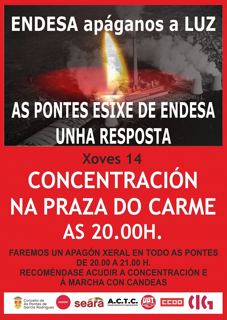 A medida de protesta estará acompañada "dun apagón xeral" nas Pontes de unha hora de duración, polo que se recomenda acudir con candeas.