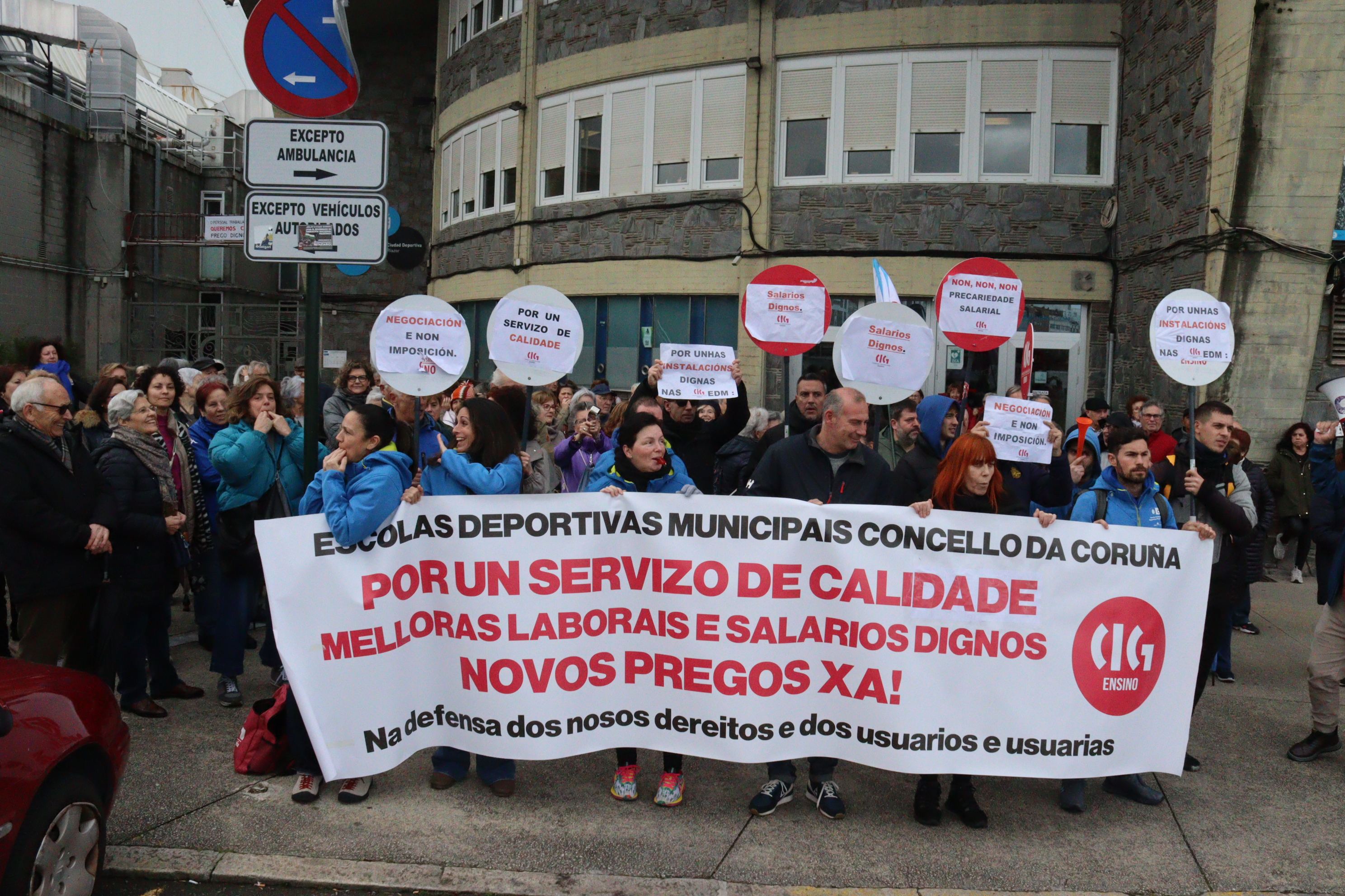 O persoal das escolas deportivas da Coruña reclama cobrar os salarios e un prego digno na cuarta xornada de folga
