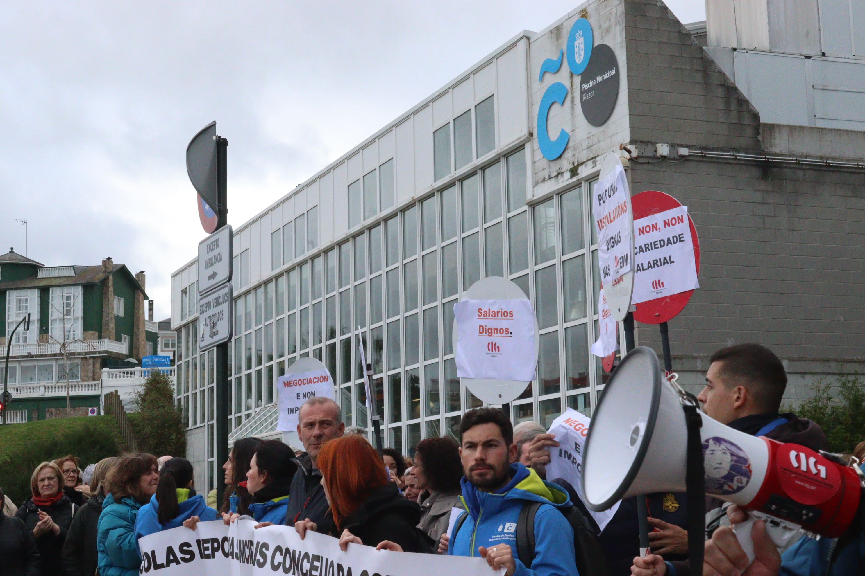 Ao berro de "melloras laborais, salarios dignos" ou "queremos cobrar e ter un prego digno", as traballadoras e os traballadores das escolas deportivas municipais da Coruña concentráronse este mediodía diante das instalacións de Riazor coincidindo coa cuarta xornada de folga convocada en defensa dos seus dereitos e por un servizo público de calidade.