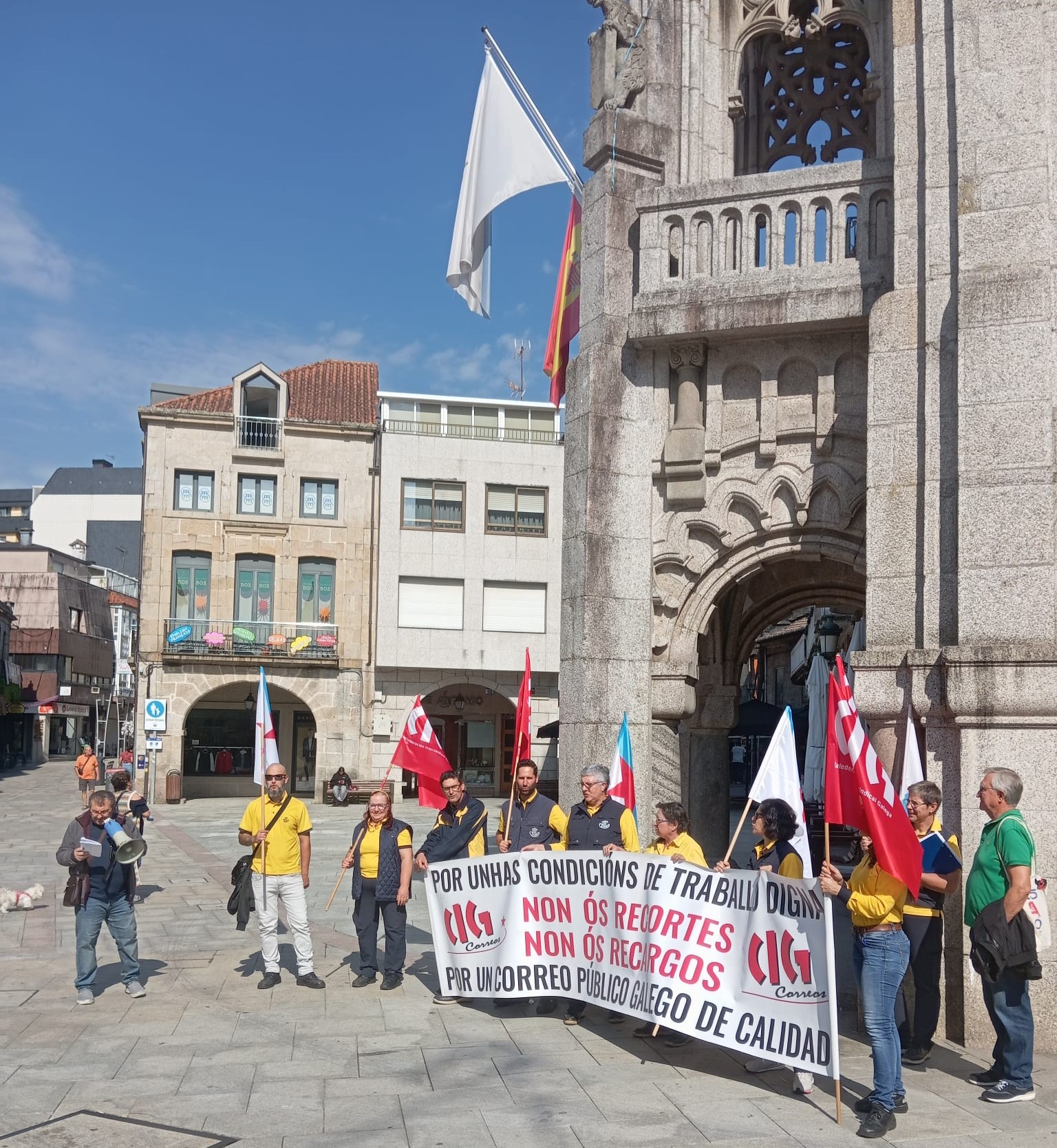 O persoal da Unidade de Reparto de Correos no Porriño mobilizouse este mediodía diante do Concello para denunciar a sobrecarga de traballo que padece tras a reestruturación da oficina coa eliminación de tres prazas, o que está a provocar acumulación de milleiros de envíos e de notificacións sen entregar.