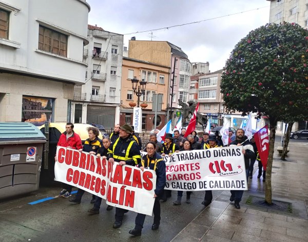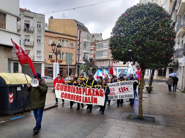 O persoal da quenda de mañá da Unidade de Reparto de Correos en Lalín percorreu hoxe en manifestación as rúas da vila cando se fan dous anos do inicio da súa loita para reclamar unhas condicións de traballo dignas, o que pasaría pola cobertura das prazas vacantes, de xeito que se remata coa sobrecarga laboral e se poida garantir un servizo postal de calidade na comarca do Deza.