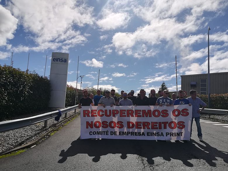 Traballadores e traballadoras de Einsa Print iniciaron este luns un calendario de mobilizacións para esixir da empresa melloras salariais e laborais, que lles permitan recuperar os dereitos perdidos tras doce anos coas condicións conxeladas. As protestas repetiranse o próximo xoves e os día 14 e 17 de outubro, con concentracións de 14 a 16 horas diante das instalacións da planta no Polígono de Penapurreira (As Pontes), coincidindo coas saídas e entradas das quendas de traballo.