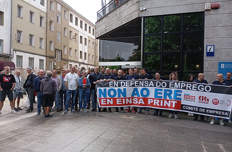 Os traballadores e as traballadoras de Einsa Print concentráronse este mércores diante do edificio da Xunta en Ferrol para amosar o seu rotundo rexeitamento ao novo despedimento colectivo que pretende aplicar a empresa e que suporía o peche da actividade de artes gráficas nas instalacións das Pontes. Na protesta, o persoal aproveitou para demandarlle ao Goberno galego que asuma responsabilidades e actúe para impedir que se materialice esta desfeita laboral que suporía un duro golpe para a localidade.
