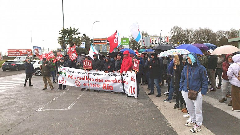 O persoal das factorías de Grupo Leche Río SA iniciou este luns mobilizacións pola mellora das condicións laborais, salariais e sociais. Os arredor de 140 traballadores e traballadoras da planta que a empresa ten no Polígono do Ceao de Lugo están secundado a primeira xornada de folga parcial de catro horas (das 12 até ás 16h) e fixeron unha concentración no acceso ás instalacións.