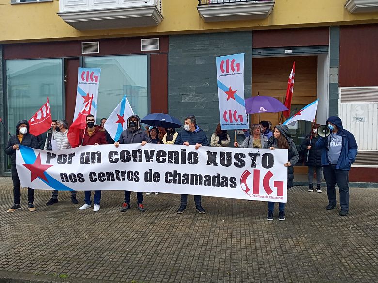Traballadoras e traballadores dos centros de chamadas de Galiza están secundando este mércores unha xornada de folga, convocada pola CIG, para esixir un convenio colectivo xusto, que dignifique as condicións laborais e salariais do sector. Con motivo do paro, realizáronse concentracións en Vigo, A Coruña, A Estrada e Sarria nas que se denunciaron as propostas de precariedade formuladas pola da patronal que, tras dous anos de negociación, non só se nega a aplicar unha suba que garanta a recuperación do poder adquisitivo dos salarios, senón que incluso pretende recortar dereitos xa consolidados.