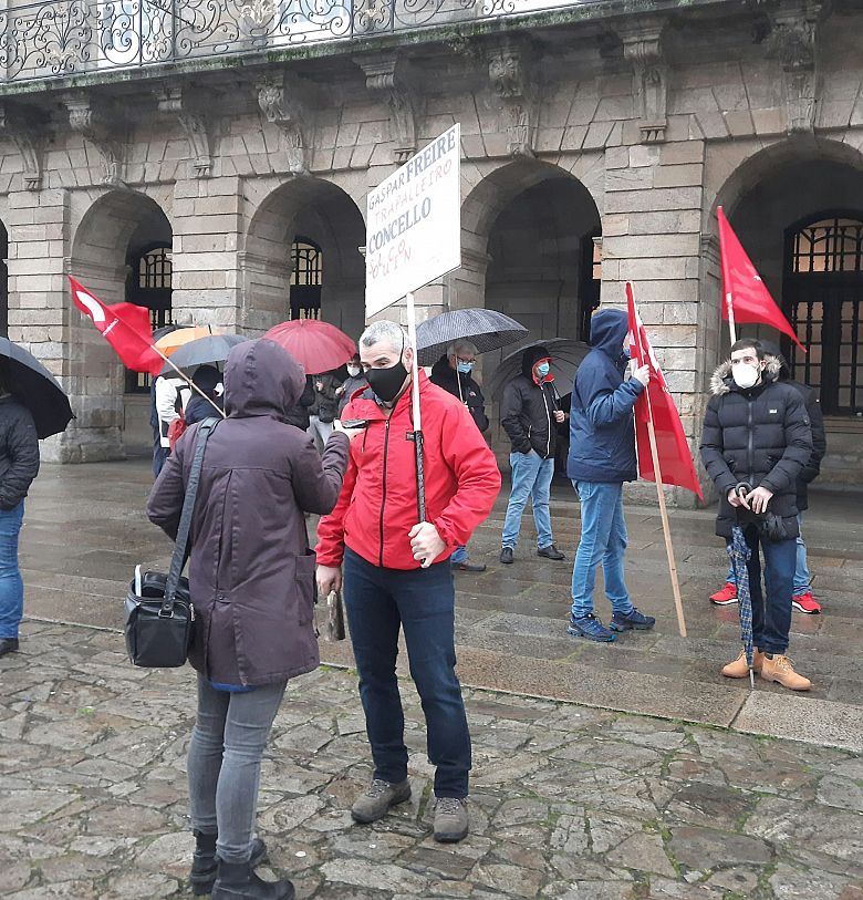 Traballadoras/es e veciños de Lavacolla concentráronse esta mañá ás portas do Pazo de Raxoi, na Praza do Obradoiro, coincidindo coa celebración do pleno municipal, para demandar unha solución para o persoal da liña de transporte do aeroporto que non foi subrogados. David Rouco, un dos 8 condutores afectados, interveu no pleno en representación de todo o colectivo onde apuntou ao Concello como “único responsable desta desfeita polas súas sucesivas decisións políticas” e demandou que se acorde “unha vía inmediata que garanta un servizo de calidade e a nosa continuidade nos postos de traballo”.