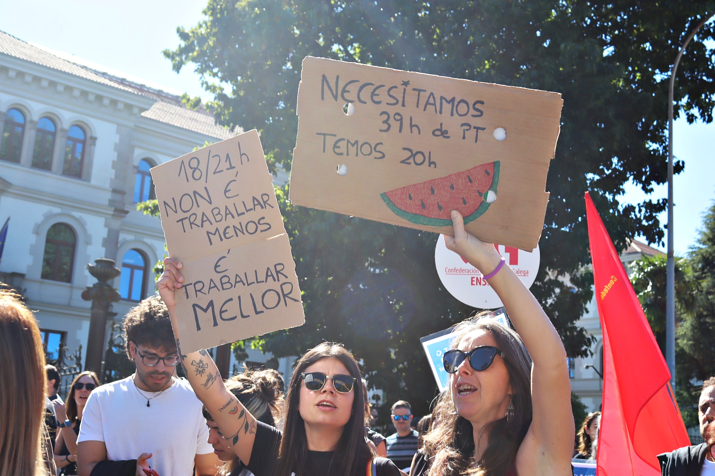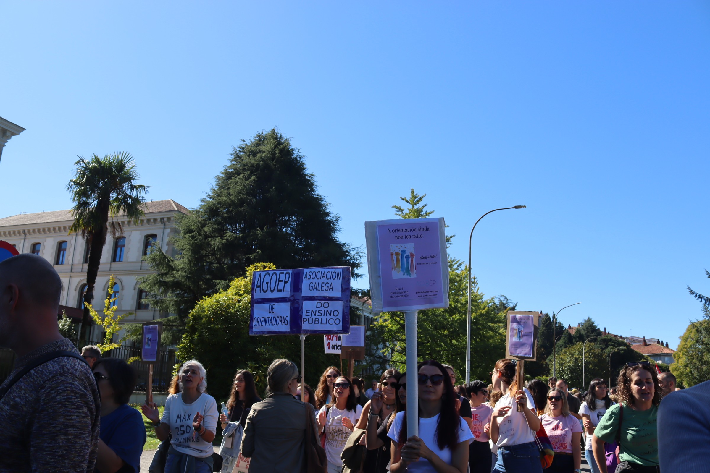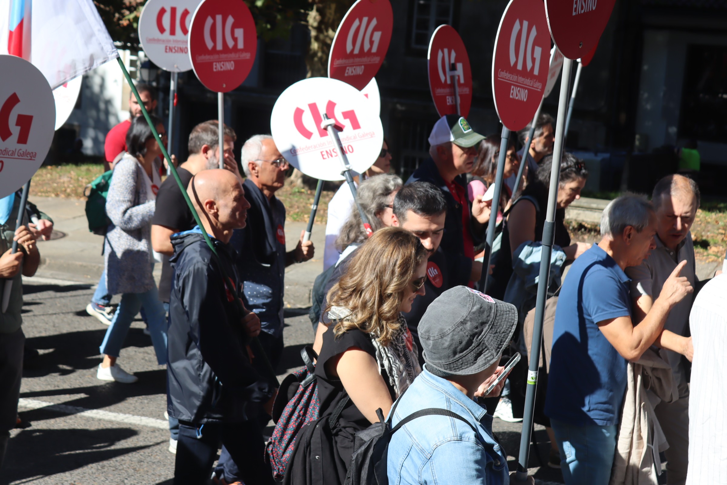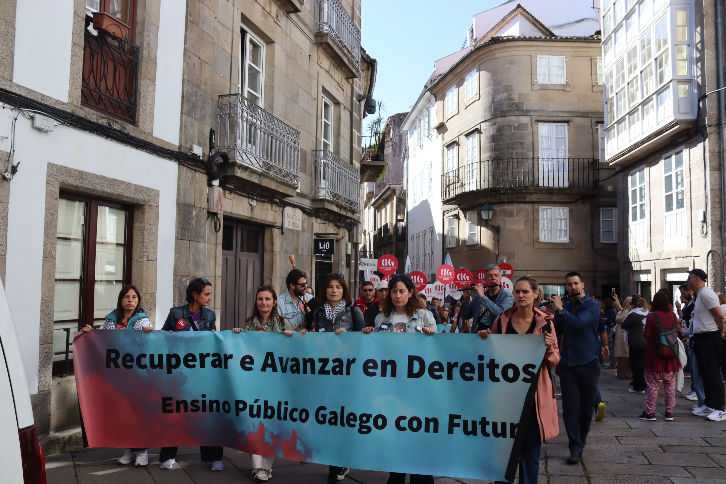 A manifestación partiu a mediodía desde a compostelá Praza de Cervantes para rematar diante da consellaría de Educación, no edificio administrativo de San Caetano. Con esta mobilización o ensino non universitario reclamaba, máis unha vez, a recuperación de dereitos, nomeadamente o horario lectivo recortado desde os anos 2011 e 2012, nos que se subiron a 25 horas en infantil e primaria e a 20 no resto de ensinanzas, respectivamente.
