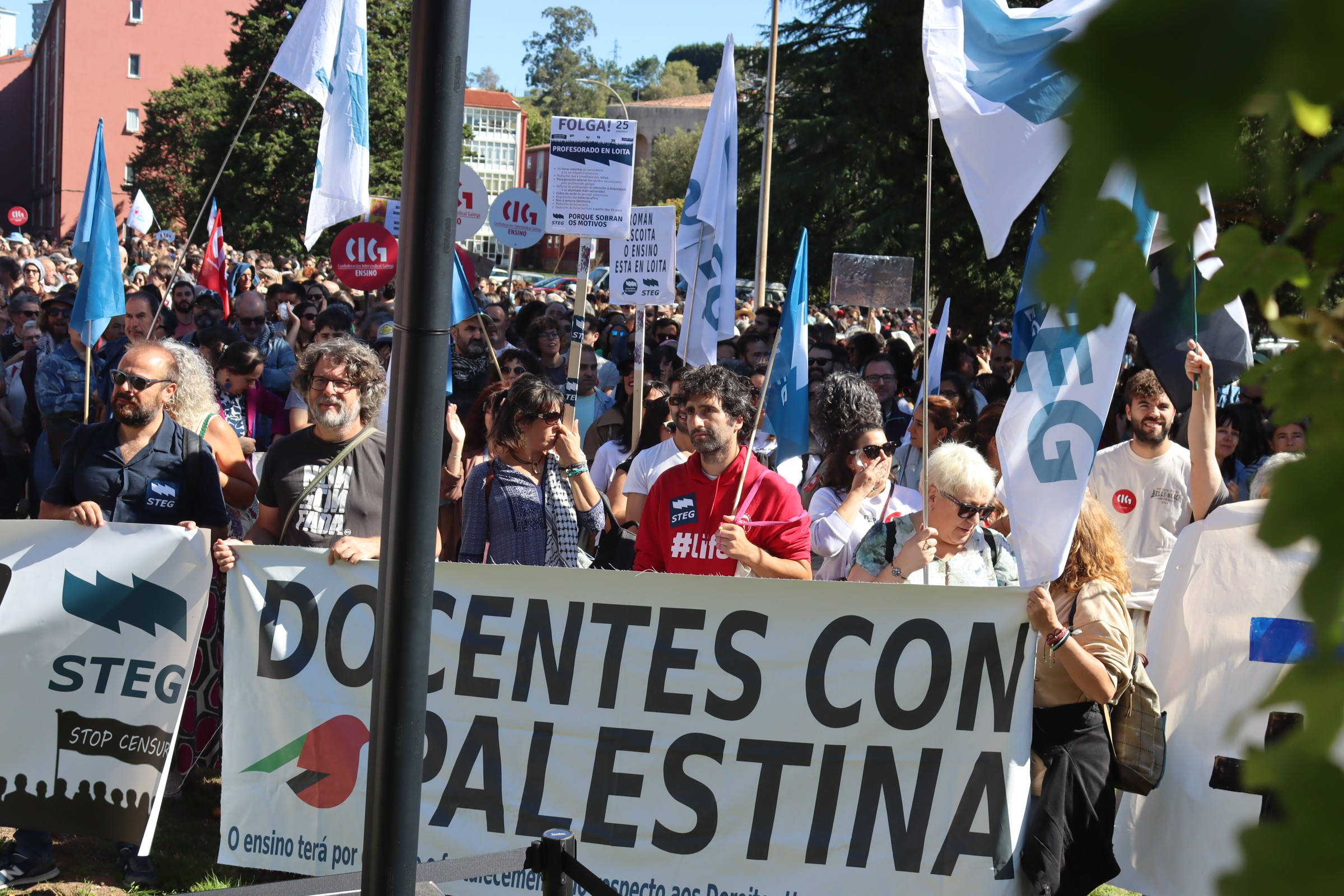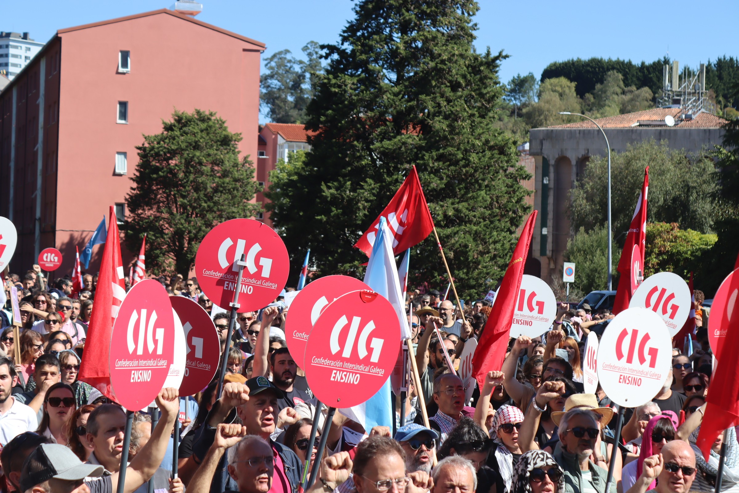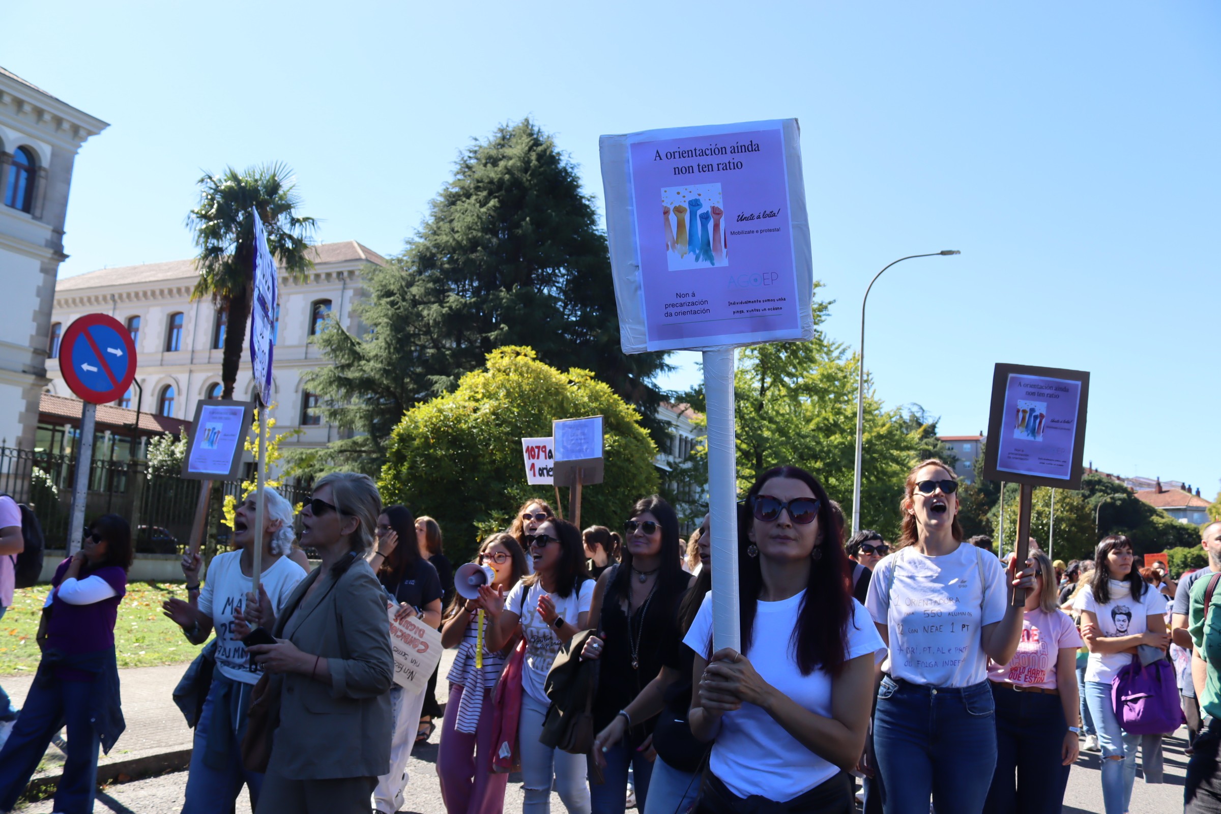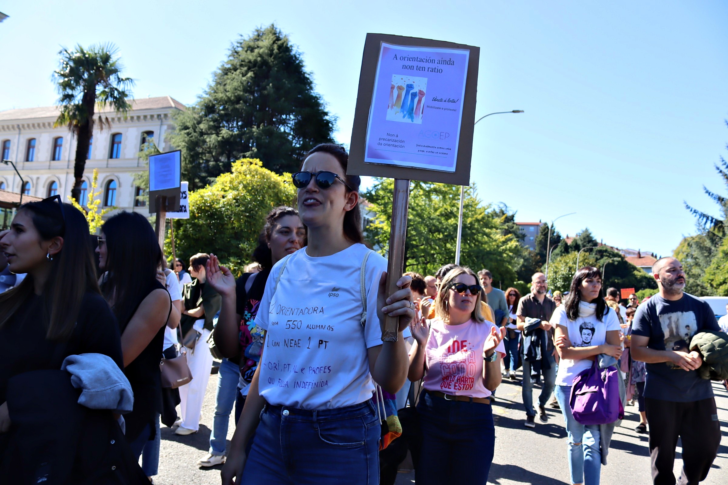 A manifestación partiu a mediodía desde a compostelá Praza de Cervantes para rematar diante da consellaría de Educación, no edificio administrativo de San Caetano. Con esta mobilización o ensino non universitario reclamaba, máis unha vez, a recuperación de dereitos, nomeadamente o horario lectivo recortado desde os anos 2011 e 2012, nos que se subiron a 25 horas en infantil e primaria e a 20 no resto de ensinanzas, respectivamente.