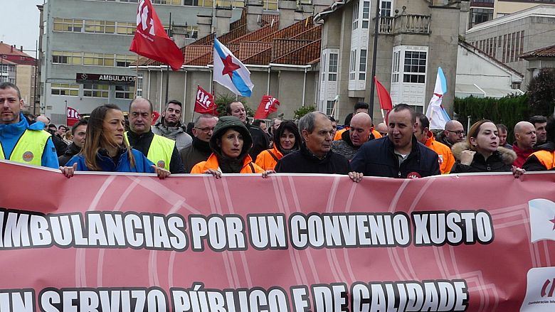 Traballadoras e traballadores do sector de ambulancias percorreron esta mañá as rúas de Compostela, desde a Estación de Tren até o edificio administrativo da Xunta de Galiza, en San Caetano, “Por un convenio digno e un servizo público de calidade”. O persoal leva meses mobilizándose en demanda de que se negocie o convenio, paralizado desde hai 3 anos, e agora, cando por fin se reuniu por primeira vez a mesa queren impedir que se intenten empeorar as súas condicións.