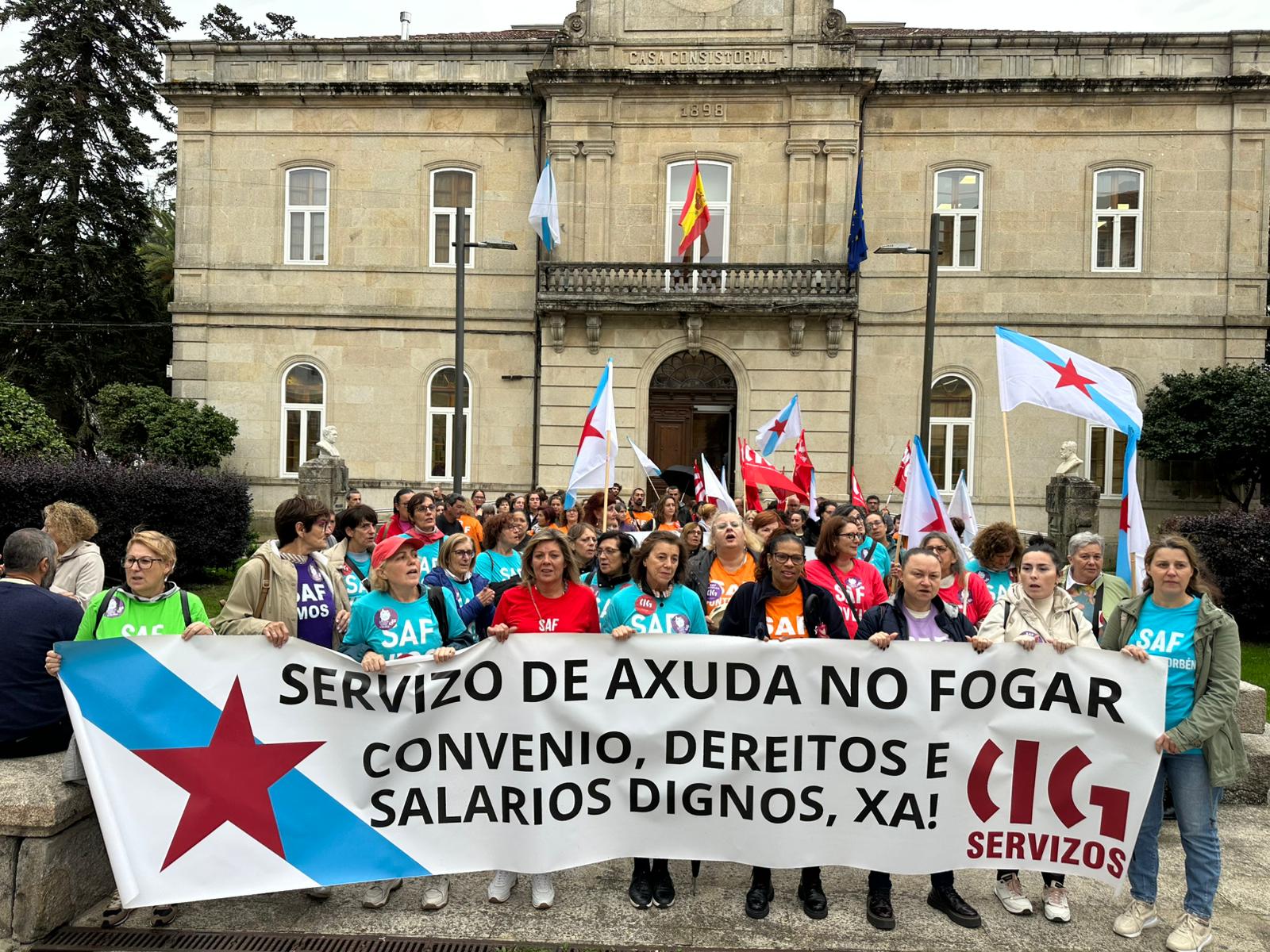 A sétima xornada de folga convocada pola CIG dende setembro no sector de coidados (residencias de maiores e centros de día privados e Servizos de Axuda no Fogar) está a ter de novo un importante seguimento, como así o evidencian as mobilizacións que tiveron lugar ao mediodía en nove localidades do país. Por outra banda, unha representación da central participou hoxe na xuntanza da mesa de traballo encargada de elaborar un protocolo de protección para o persoal dos SAF, na que se evidenciou que o presidente da Xunta intentou “vender” a existencia dun protocolo “que en realidade é só un esquema de traballo”.