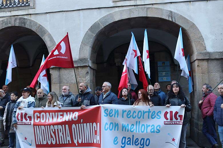 Delegadas e delegados do sector de Químicas de CIG-Industria concentráronse esta mañá diante da sede da Confederación de Empresarios de Galiza para solicitar unha xuntanza coa representación da Federación Empresarial Galega da Industria Química, coa fin de explorar a posibilidade de iniciar a negociación dun acordo galego para a industria química, dándolle prioridade aplicativa ao mesmo.