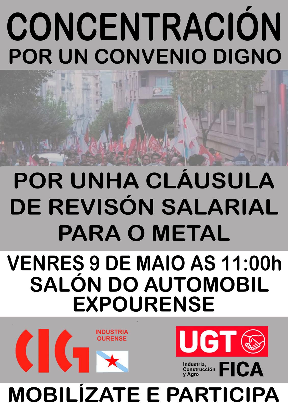 O sector do siderometal ourensán convoca novas mobilizacións para reclamar un convenio colectivo provincial digno, xa que tras oito xuntanzas da mesa negociadora a patronal insiste nunha proposta insuficiente que non garante o poder adquisitivo nin contempla reducións de xornada. De xeito que a CIG e UGT desenvolverán unha concentración este venres día 9 no recinto feiral Expourense ás 11:00 horas coincidindo coa celebración do VII Car Outlet.