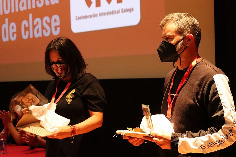 Antes de se iniciar as intervencións do acto de clausura, Margarida Corral, até o de agora secretaria das Mulleres da CIG, e Fran Cartelle, até o de agora secretario confederal de Emprego, recibían o aplauso unánime do Congreso en recoñecemento ao labor desenvolvido en todos estes anos como membros da Executiva Confederal e un agasallo de mans do secretario xeral, Paulo Carril.