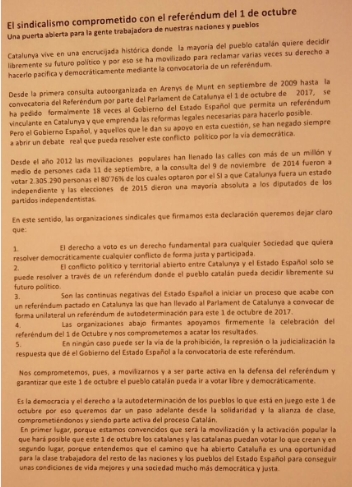 Lembran que o que está en xogo este 1 de outubro “é a democracia e o dereito de autodeterminación dos pobos” e “desde a solidariedade e a alianza de clase” manifestan o seu compromiso a “ser parte activa do proceso catalán” porque entenden que “o camiño que abriu Catalunya é unha oportunidade para a clase traballadorado do resto das nacións e pobos do Estado para conseguir unhas condicións de vida mellores e unha sociedade moito máis democrática e xusta”.