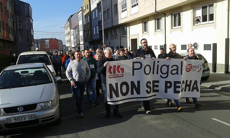 Os traballadores e traballadoras de Poligal saíron en manifestación este luns dende as instalacións da fábrica no Polígono da Gándara até a Casa do Concello de Narón en defensa dos seus empregos e da continuidade da actividade produtiva. Esta protesta enmárcase no calendario de mobilizacións e contactos institucionais que o persoal vai realizar en reposta á solicitude de concurso de acredores presentada pola empresa, a través do que pretende a liquidación da fábrica.