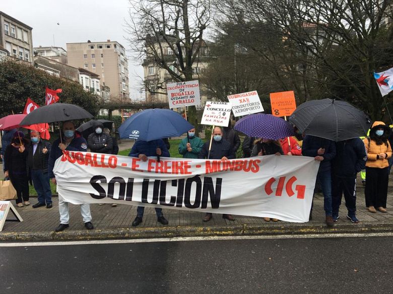 Os condutores da liña do aeroporto inxustamente despedidos concentráronse esta mañá na Praza de Galiza para denunciar o empeoramento do servizo e reclamar que se garanta a subrogación do persoal cando saian os pregos do novo concurso para o transporte urbano de Santiago.