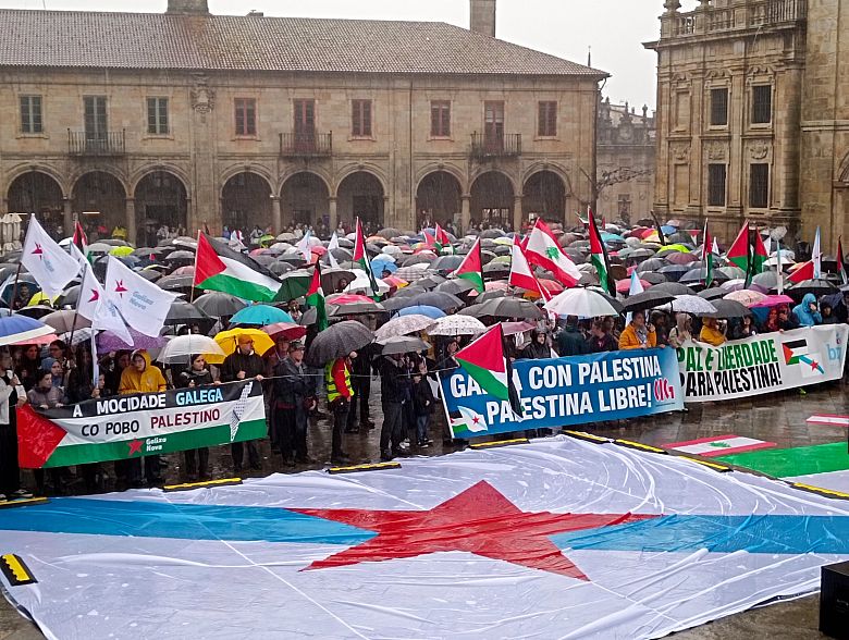 Miles de persoas, chegadas de todos os recunchos de Galiza, desafiaron a intensa chuvia compostelá para berrar contra un ano de masacres e destrución que parece non ter fin; polas máis de 46.000 vítimas mortais ás que lles segaron a voz; contra a impunidade dos crimes de Israel e para dicir aínda “máis alto e máis claro que nós, galegas e galegos, non participaremos en silencio deste xenocidio televisado por moito que si o faga quen nos goberna coas súas declaracións hipócritas e a súa falta de acción”.