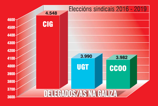 Tras se publicar a resolución que recolle os datos de representatividade sindical na Galiza -correspondente ao período de eleccións sindicais 2016-2019, rematado o pasado 31 de decembro- confírmase que a CIG é a primeira forza sindical, con 4548 delegados e delegadas, fronte as 3990 de UGT e 3982 de CCOO. Un resultado histórico que, segundo o secretario xeral, Paulo Carril, vén avalar o modelo sindical que representa a central sindical mais que, advertiu, non é para sempre. “A clave está en ser un instrumento útil e capaz, de contrapoder real fronte á explotación de clase”.