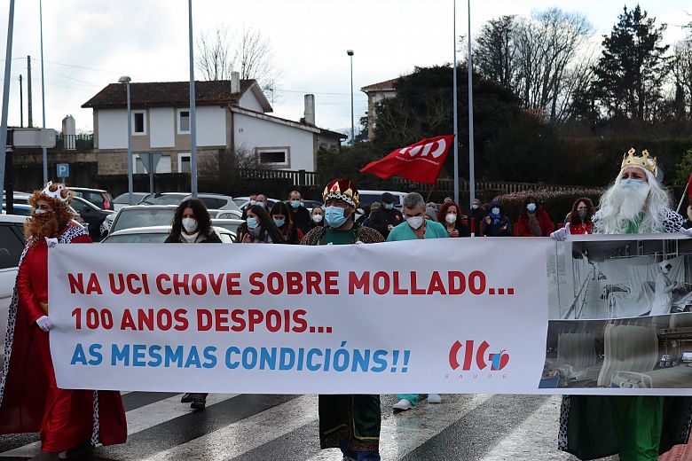 Os Reis Magos chegaron esta mañá ás portas do Hospital Clínico de Compostela cargados de peticións para a Xerencia do centro hospitalario. As súas maxestades sumáronse ás demandas do persoal “por unha UCI de Adultos digna” e mesmo encabezaron a improvisada manifestación coa que hoxe se celebraba a oitava semana de folga. Case dous meses de mobilizacións sen máis resposta que a dilación das solucións, sen que se melloraran as condicións nas que persoal desenvolve o seu traballo ou se garantira o mínimo de intimidade para as e os doentes ingresados nesta unidade.