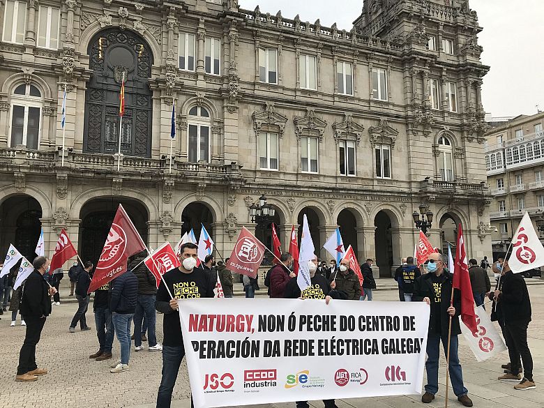 Os traballadores do Centro de Operación de Rede de Naturgy da Coruña concentráronse este xoves na Praza de María coincidindo coa declaración institucional lida no pleno municipal en defensa do continuidade das instalacións e dos empregos. Cómpre lembrar que a eléctrica, que explota aproveitamentos hidráulicos, ten parques eólicos e que está conseguindo novos MW en enerxías renovábeis na Galiza, anunciou a clausura deste centro e o traslado dos seus 27 traballadores a centos de quilómetros ou, no caso de non aceptar, ir ao desemprego.