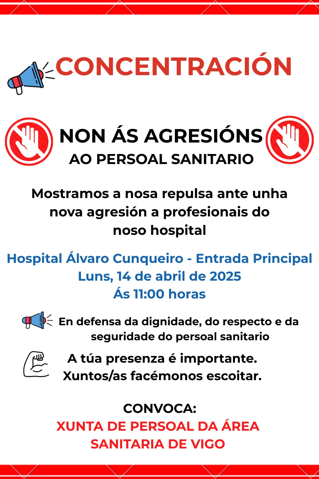 Persoal da área sanitaria de Vigo mobilizouse hoxe no Álvaro Cunqueiro en solidariedade coas persoas traballadoras agredidas física e verbalmente o pasado xoves no hospital e para demandarlle á Xerencia a adopción de medidas urxentes de carácter preventivo ante o aumento deste tipo de incidentes.