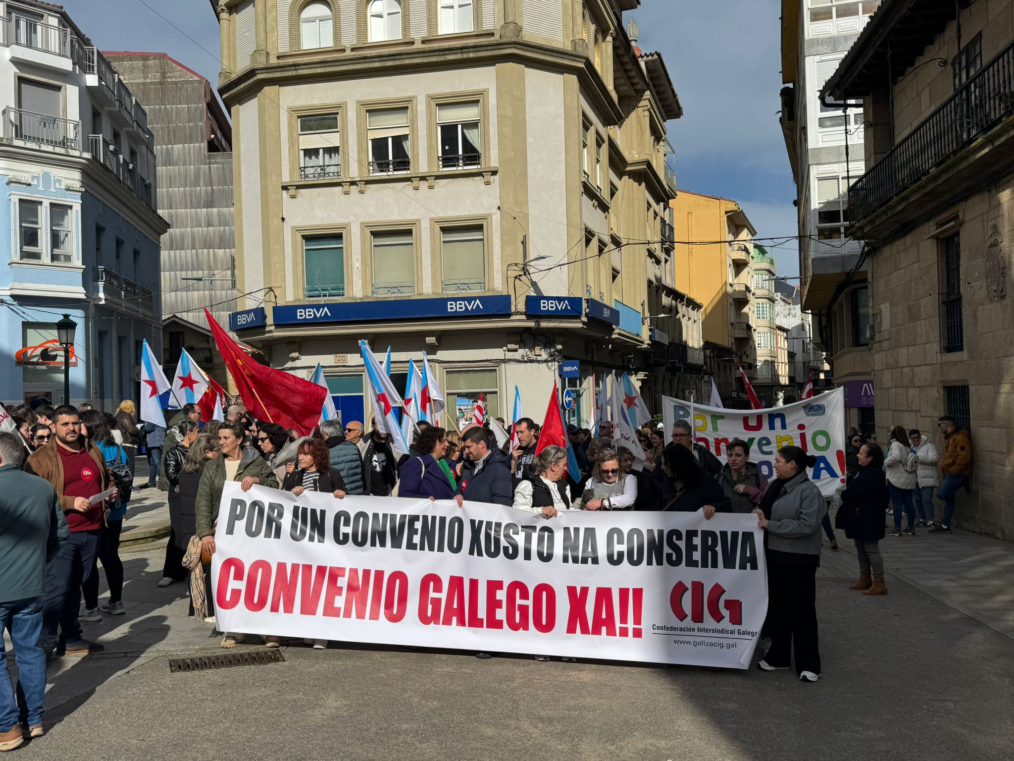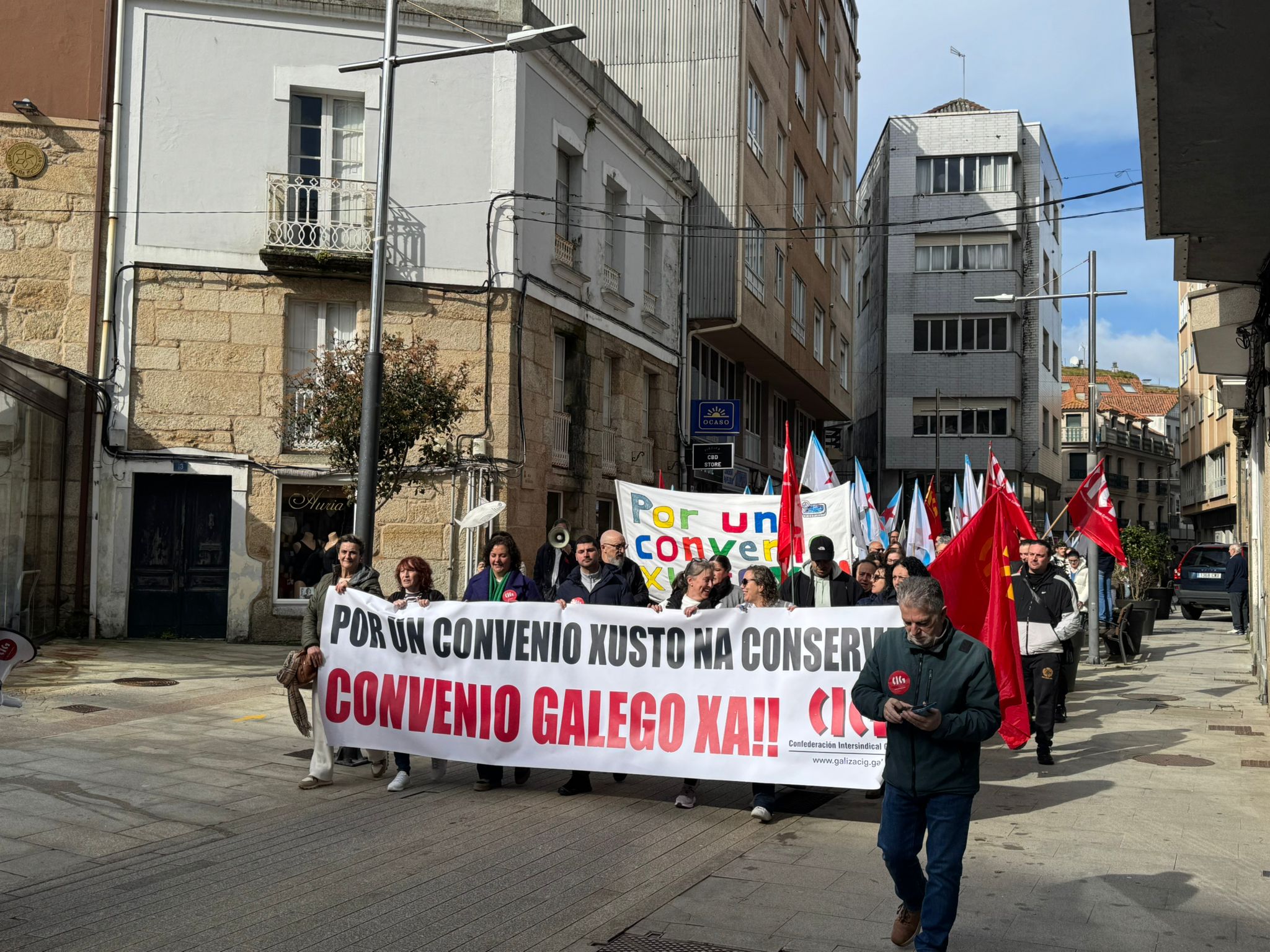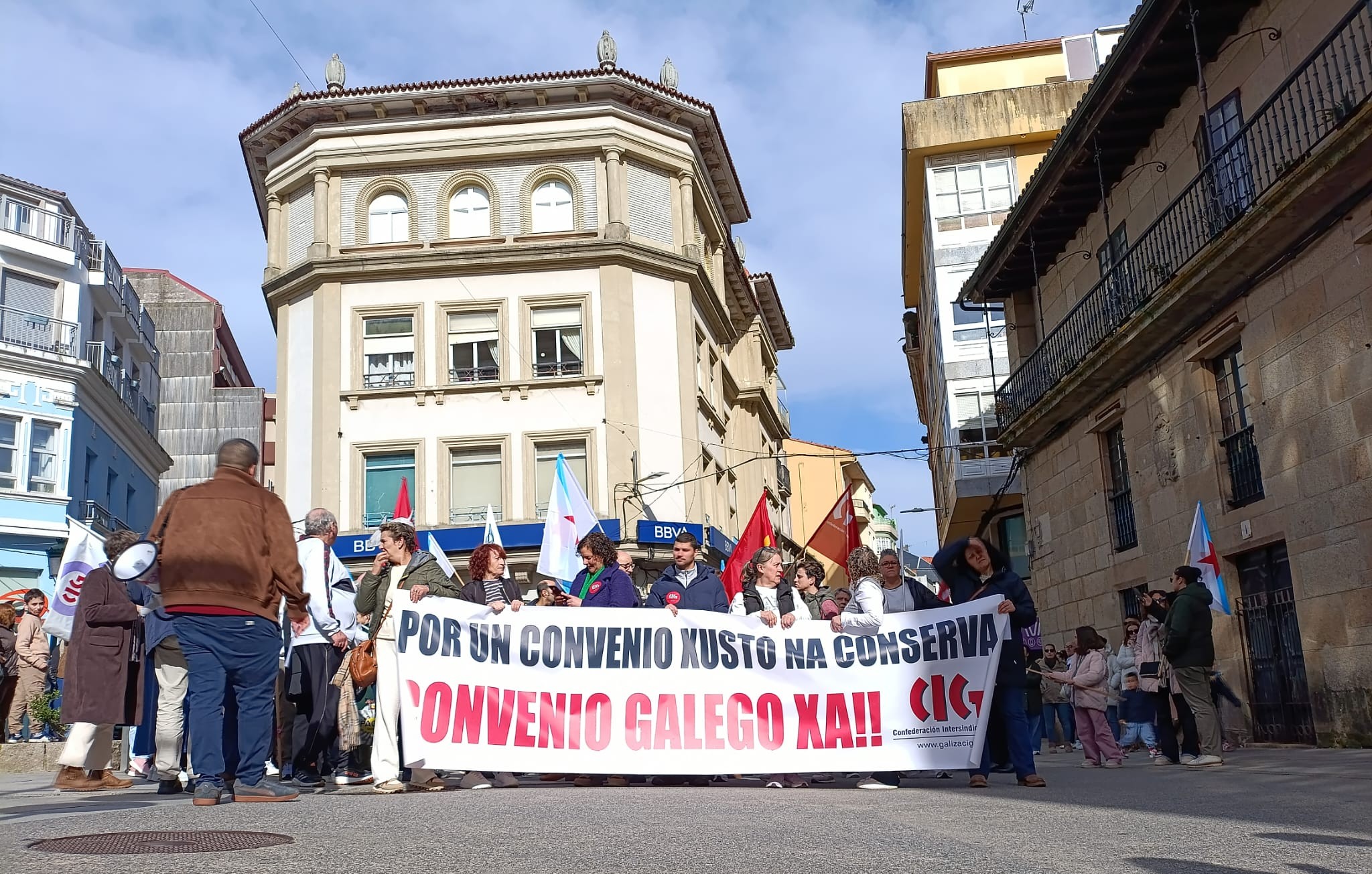 Persoal do sector conserveiro galego volveu mobilizarse hoxe para rexeitar o acordo de convenio colectivo regresivo asinado en Madrid por UGT e CCOO. Varios centos de persoas traballadoras percorreron as rúas da localidade barbancesa de Ribeira para reclamar unha suba salarial real e unha redución da xornada laboral.