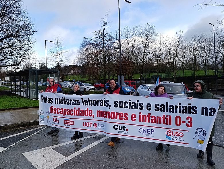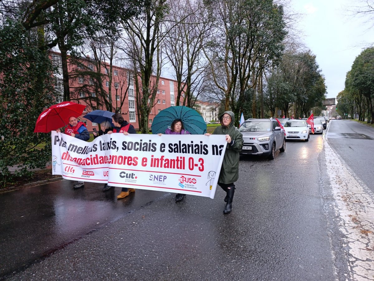 A protesta foi convocada por CIG-Ensino, CCOO Ensino, UGT-SP Ensino, USO, CUT e SNEP quen xa anunciaron novas mobilizacións nas rúas e nos centros de traballo se a Consellaría de Política Social -que ten a compentencia nestes ámbitos- segue facendo oídos xordos as xustas e lexítimas reivindicacións do persoal.