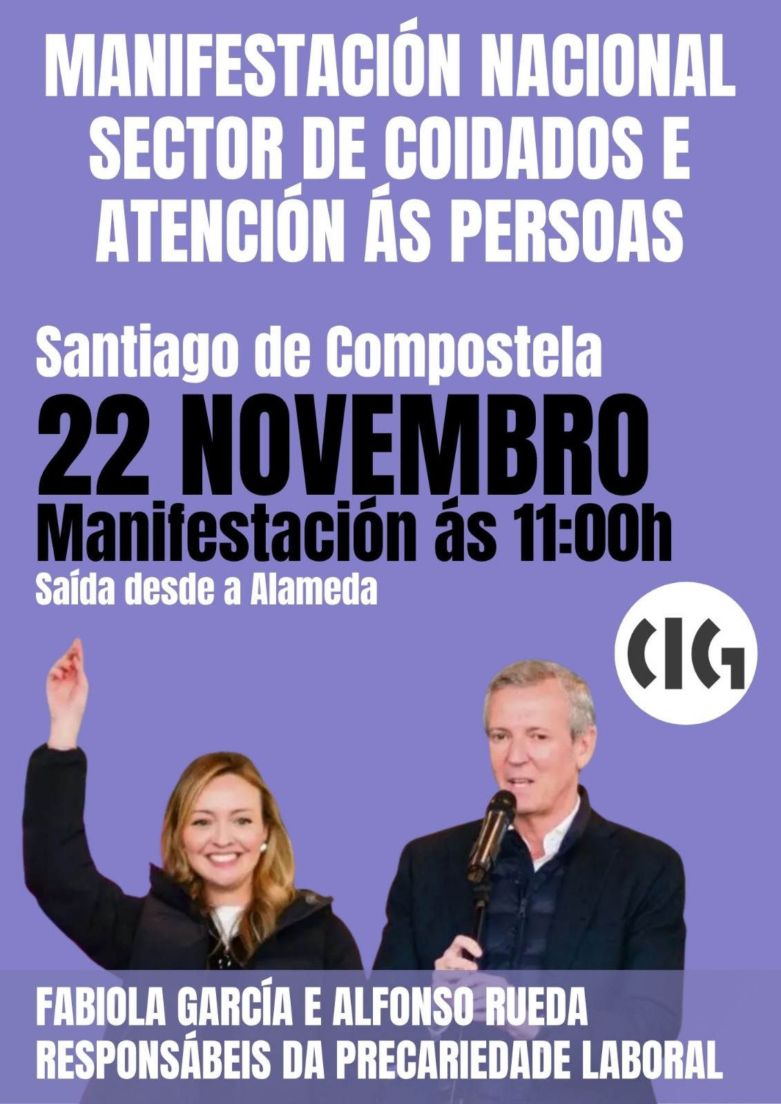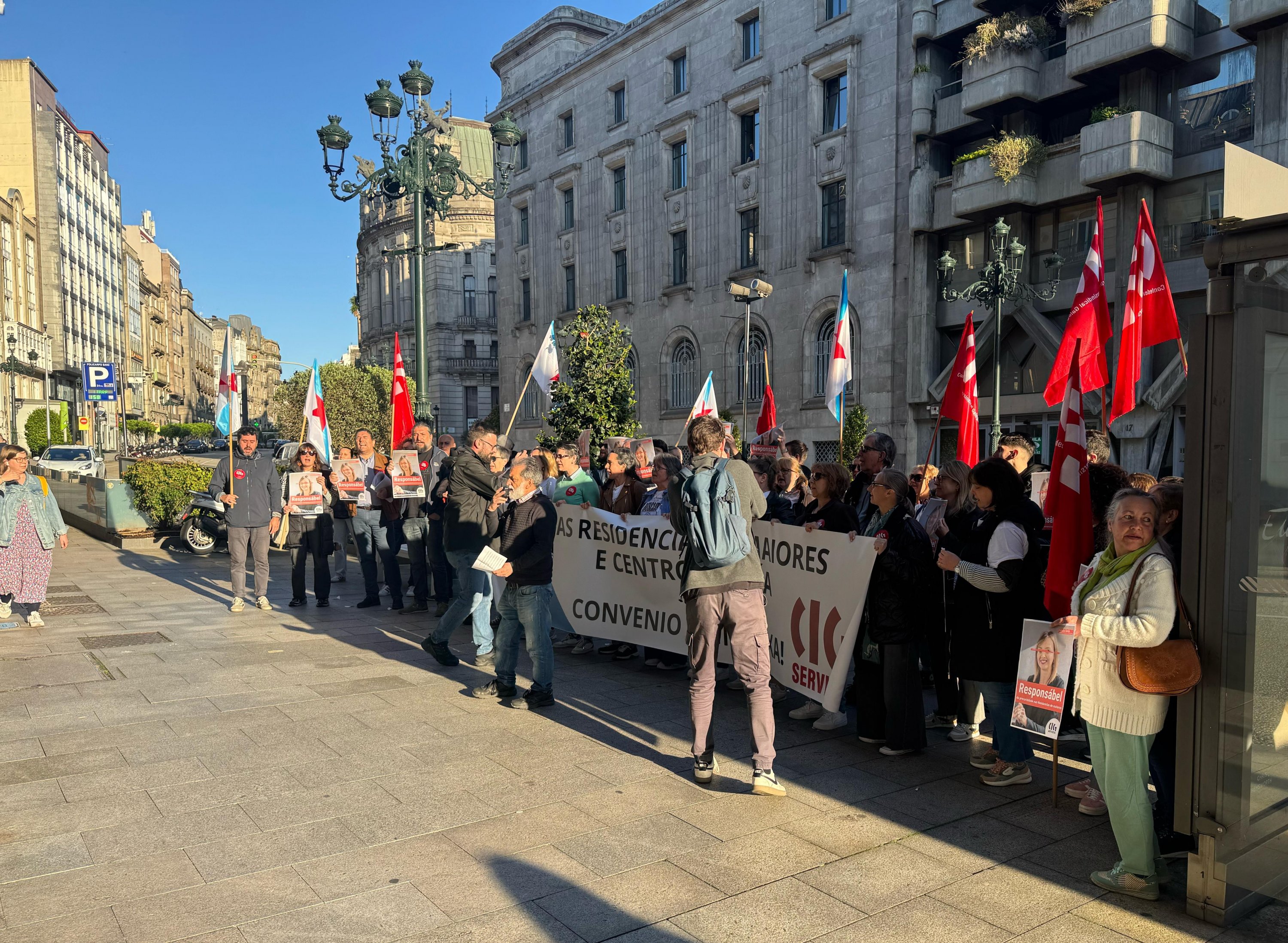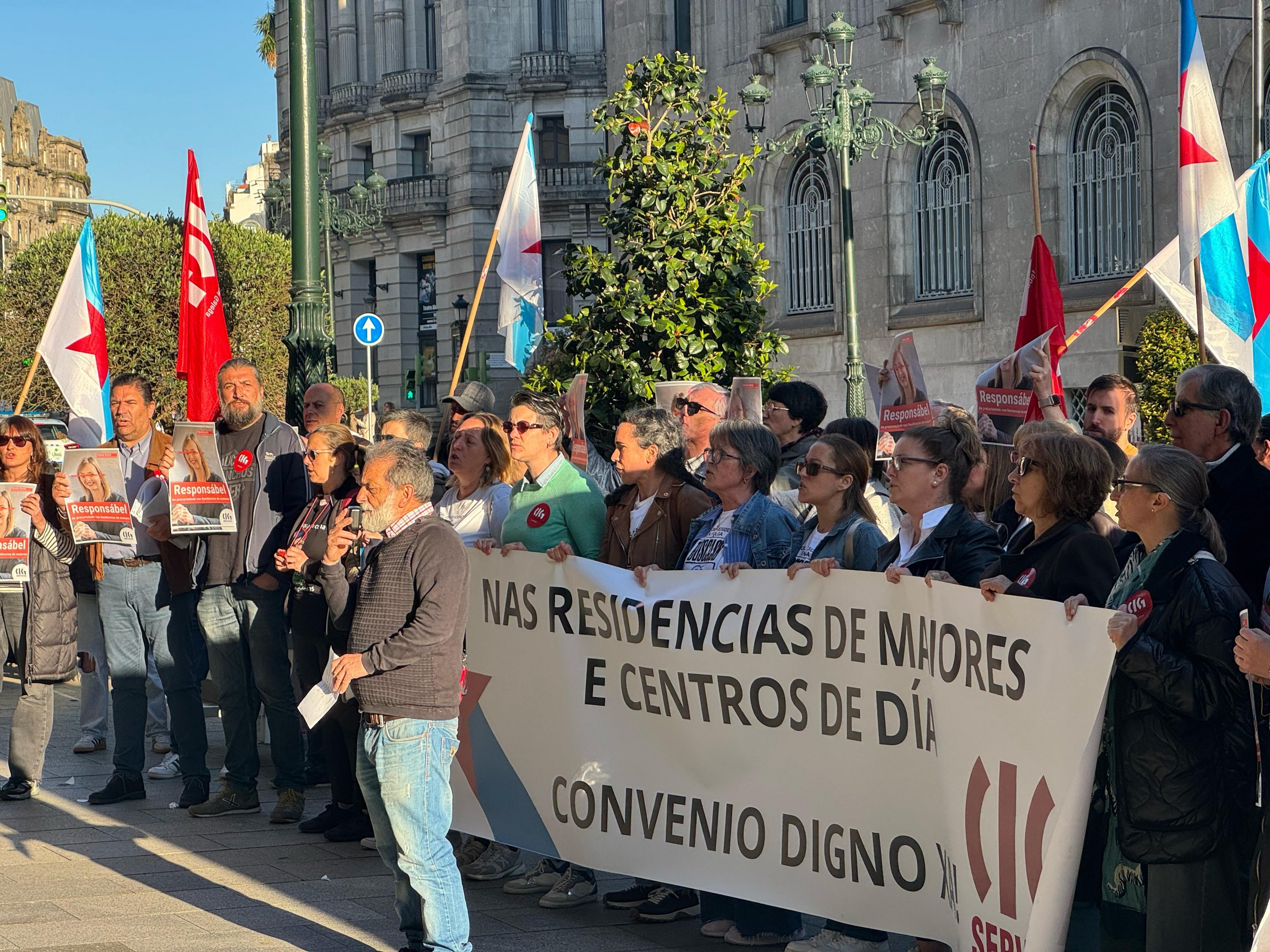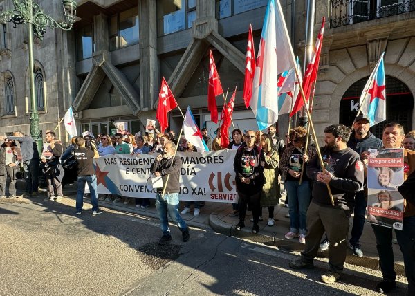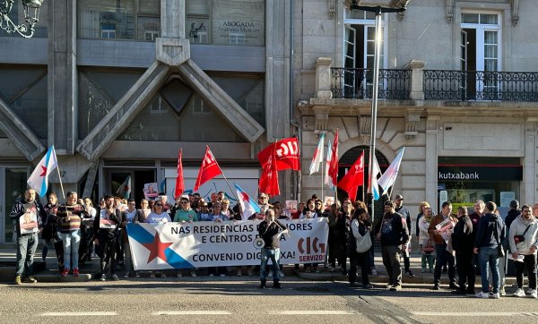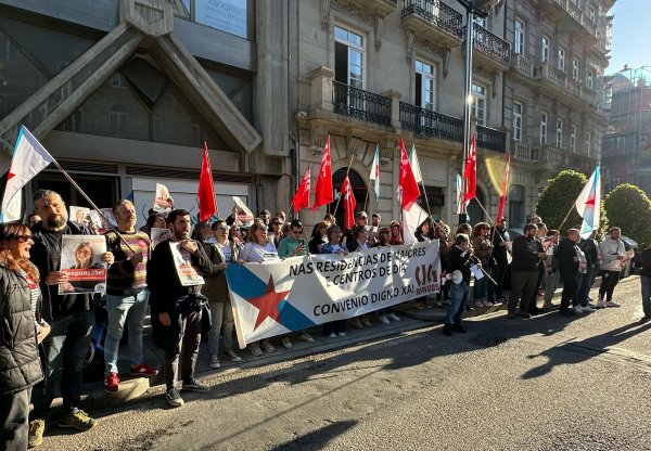 Persoas traballadoras das residencias da terceira idade privadas chegadas dende distintos puntos de Galiza mobilizáronse hoxe en Vigo convocadas pola CIG no marco da loita que están a desenvolver para reclamar un convenio colectivo digno. Nesta ocasión trasladaron as súas reivindicacións ao XXII Congreso da Confederación Española de Organizaciones de Mayores (CEOMA), no que participaban, entre outros responsábeis políticos, o presidente da Xunta, Alfonso Rueda, e a conselleira de Política Social, Fabiola García.