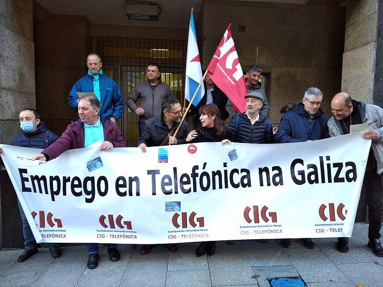 Un grupo de traballadores/as de Telefónica mobilizouse hoxe diante das instalación da empresa no Calvario, en Vigo, convocados pola CIG coincidindo coa xornada de folga que se desenvolveu a nivel estatal para rexeitar as pretensións da compañía de despedir de 5000 empregados/as no conxunto do Estado (300 deles/as en Galiza). Dende a central sindical denuncian que con este anuncio a compañía pretende chantaxear os empregados/as de cara á negociación do próximo convenio colectivo.