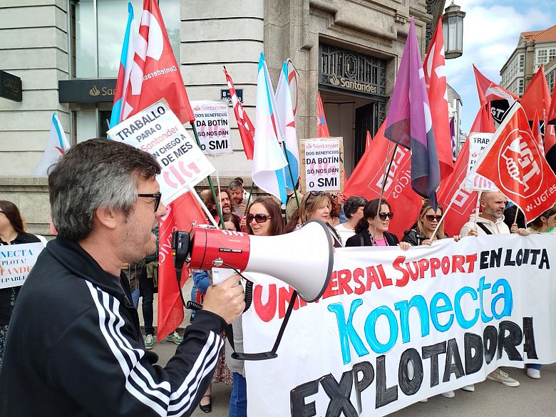 Traballadores e traballadoras de Universal Support concentráronse este mércores diante da oficina do Banco Santander no Cantón Grande (antiga sede do Banco Pastor) en demanda dunha melloras das condicións laborais na campaña Superliña. O comité leva meses reclamándolle á empresa que sente negociar para abordar a desorganización do traballo e a precarización laboral, mais sen recibir resposta.