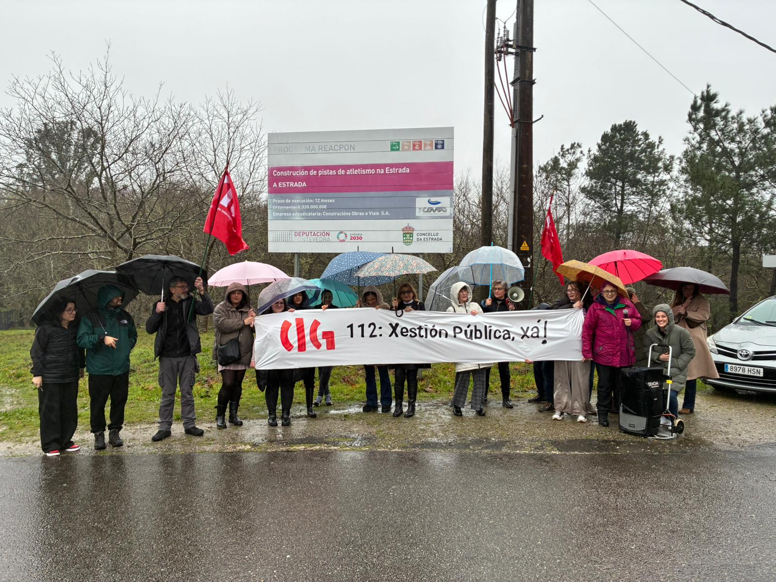 Con motivo do Día europeo do 112, e malia a intensa choiva e o vento, persoal que atende este servizo en Galiza concentrouse no recinto da Academia Galega de Seguridade Pública da Estrada para reclamar condicións laborais e salariais dignas e a xestión directa e pública do 112 por parte da Xunta de Galiza. Hai que lembrar que este servizo, aínda sendo esencial na atención ás emerxencias, está privatizado e o persoal que o presta padece condicións de auténtica precariedade.