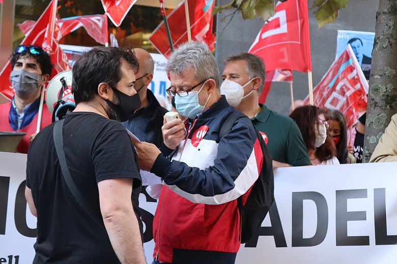 Traballadores e traballadoras do Sabadell sumáronse esta mañá á mobilización conxunta convocada diante de dúas das oficinas que o banco ten en Santiago para manifestar o seu rexeitamento á pretensión da entidade de despedir a 1.936 persoas e pechar o 38% das oficinas en Galiza.
