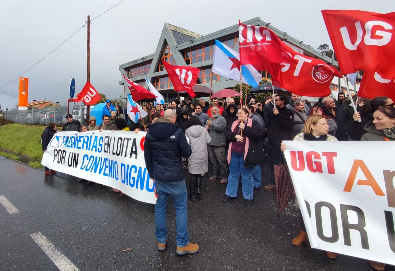 Persoal do sector de enxeñarías mobilizouse este mércores diante da sede de Applus Norcontrol en Sada para reclamar un convenio colectivo digno, con condicións salariais e laborais xustas, que estabeleza unha correcta clasificación profesional, que poña en valor o esforzo que asumen as traballadoras e traballadores e que regule unha verdadeira carreira profesional.