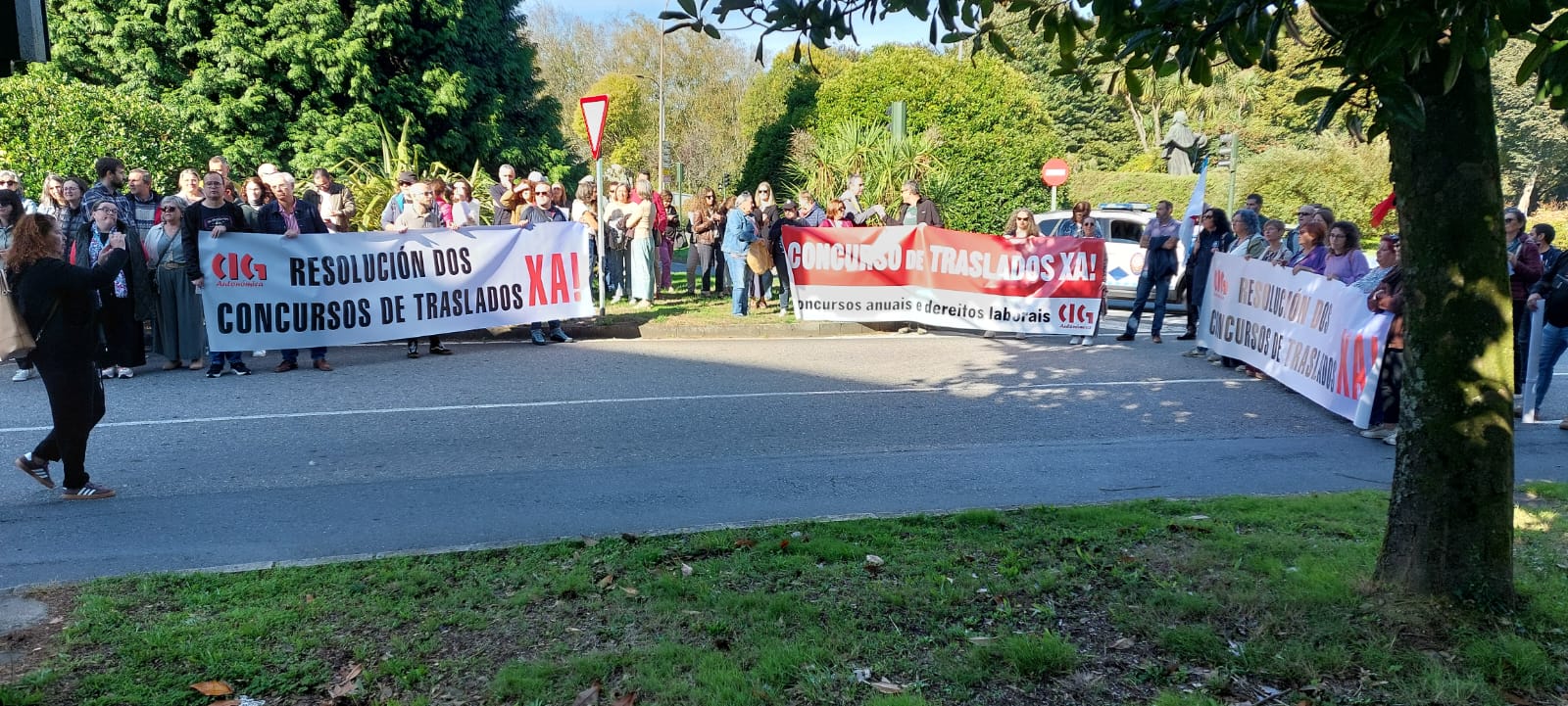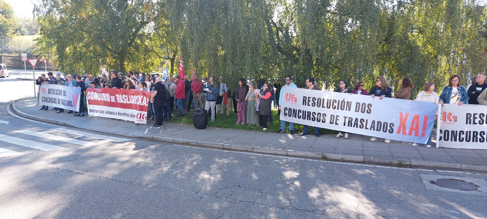 Traballadoras e traballadores da Xunta de Galiza concentráronse na mañá deste martes diante do edificio administrativo de San Caetano para exixir unha solución inmediata aos concursos de traslados, paralizados dende hai anos. Con esta protesta, convocada pola CIG-Autonómica, reclaman que se garanta unha prelación xusta de dereitos na provisión dos postos, a axilización da resolución dos procesos multiplicando os medios humanos e materiais e a duplicidade dos postos bloqueados de maneira cautelar por resolución xudicial.