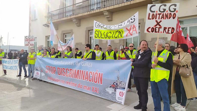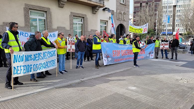 Persoal gardacostas concentrouse este martes diante da Delegación do Goberno na Coruña para denunciar a discriminación que sofren e reclamar que se inclúa a este colectivo no réxime especial do mar e se lle recoñeza o dereito a acceder a xubilación anticipada.