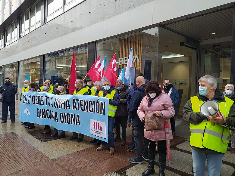 O colectivo de persoas xubiladas e pensionistas da CIG de Vigo desenvolveu hoxe unha mobilización no cruzamento de Colón para reclamar unha atención bancaria digna e rexeitar os abusos das entidades financeiras. Dende a central sindical denuncian que os bancos discriminan a multitude de cidadáns, “sobre todo ás persoas maiores, especialmente das zonas rurais do país, ao fiar todo á banca electrónica”.