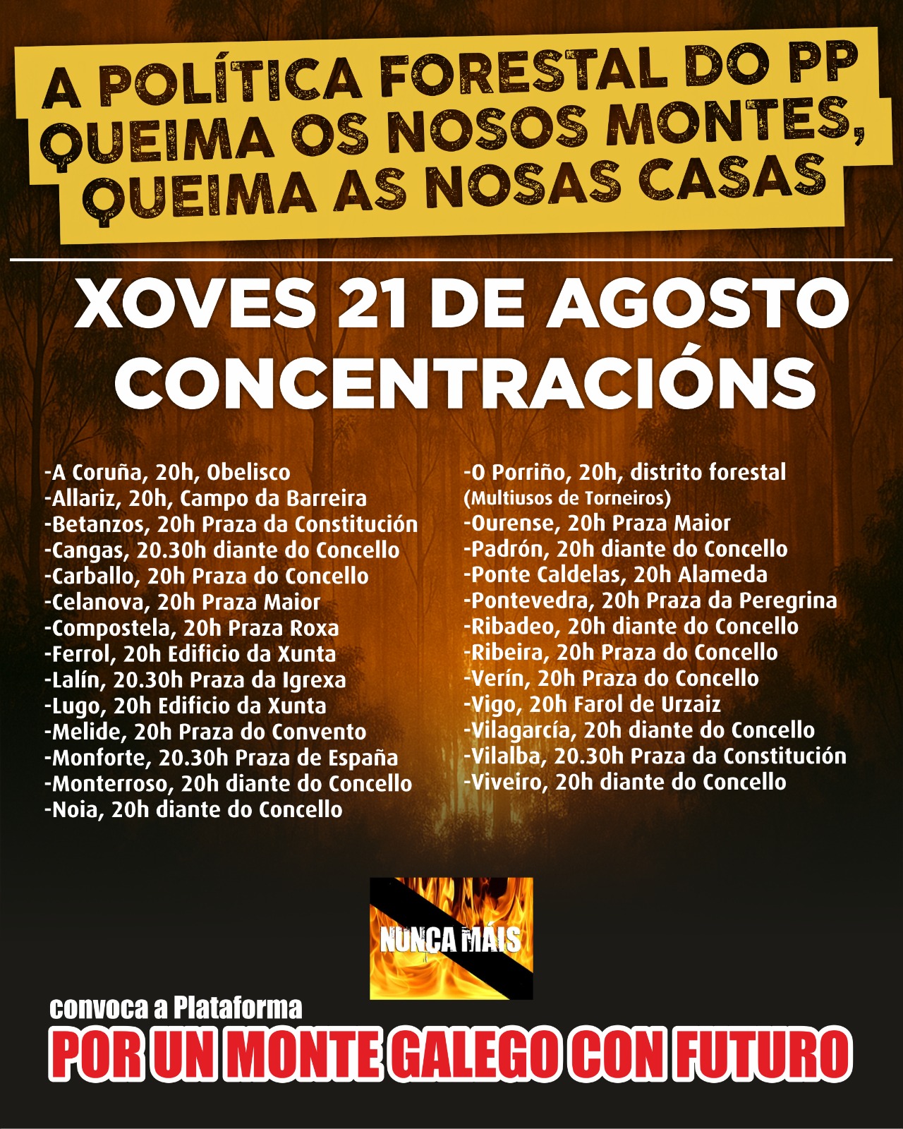 A plataforma ‘Por un monte Galego con Futuro’ convoca mobilizacións para denunciar que a actual vaga de incendios que está a padecer Galiza é consecuencia directa da política forestal do PP, unha política forestal que, tal e como recolle o lema escollido para as protestas, “queima os nosos montes e as nosas casas”. A CIG, que fai parte da plataforma e que tomou a iniciativa de impulsar a convocatoria, fai un chamamento a participar nas 26 concentracións que terán lugar este xoves 21 de agosto por todo o país a partir das 20:00 horas.