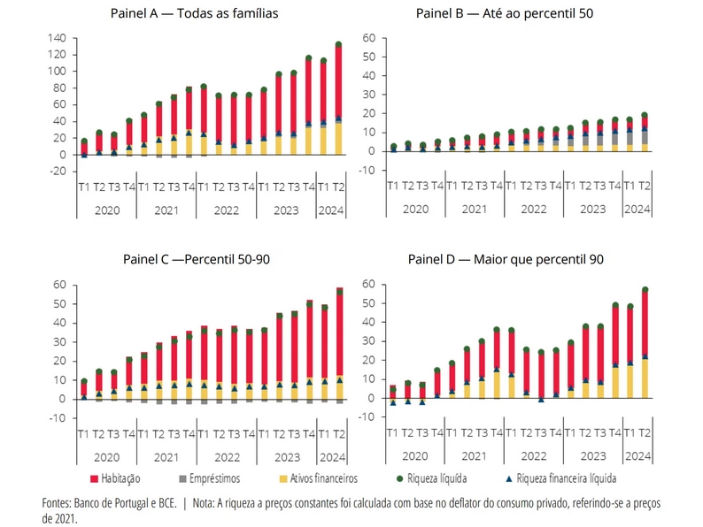 Quando olhamos para as estatísticas sobre a riqueza líquida das famílias - isto é, o valor total dos ativos menos o valor das dívidas - aumentou de forma assinalável desde a pandemia. Essa evolução deve-se, em grande medida, à valorização da habitação (a vermelho, no gráfico abaixo), que passou a representar uma fatia ainda maior do património das famílias portuguesas e se tornou o principal motor do aumento da riqueza nacional.