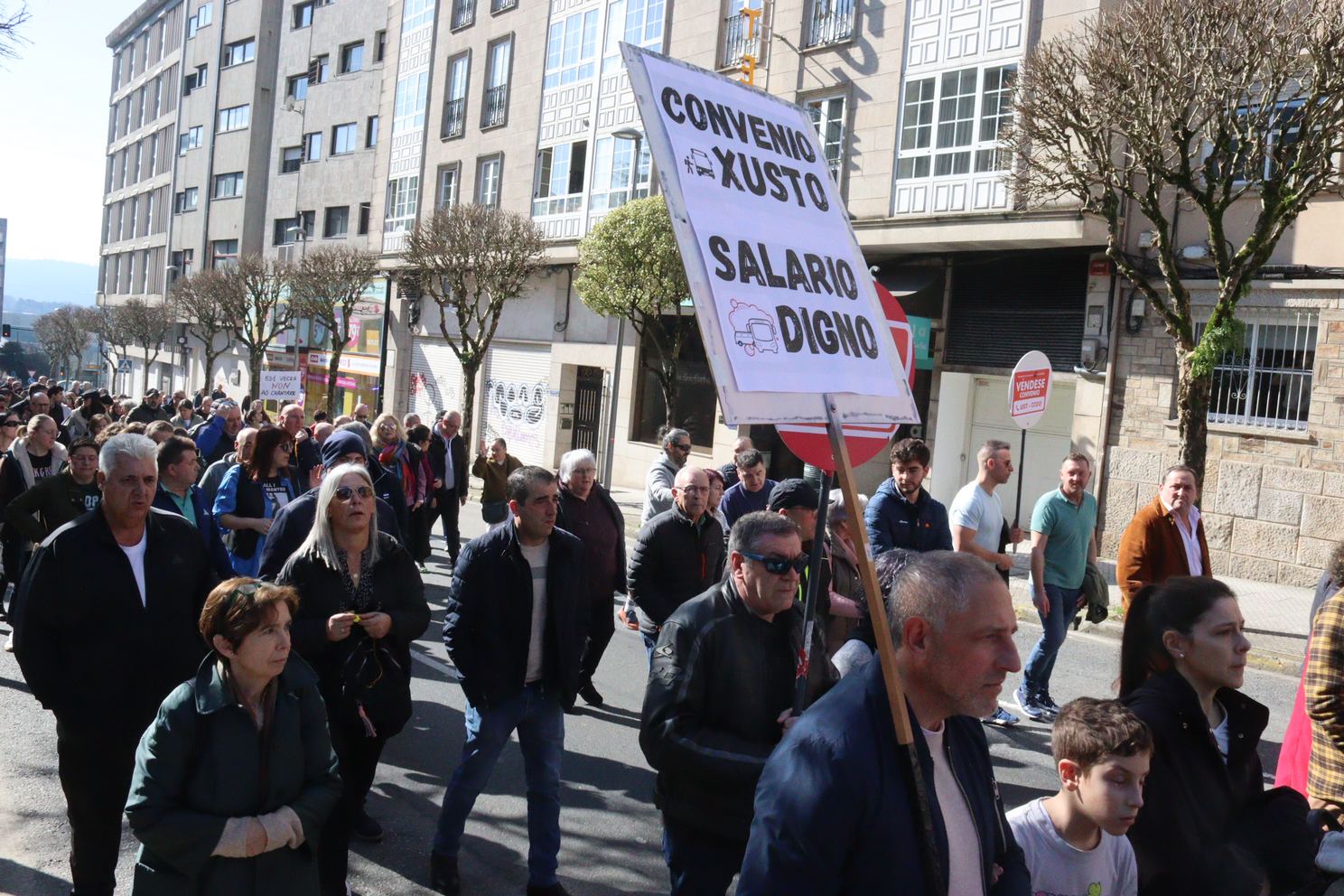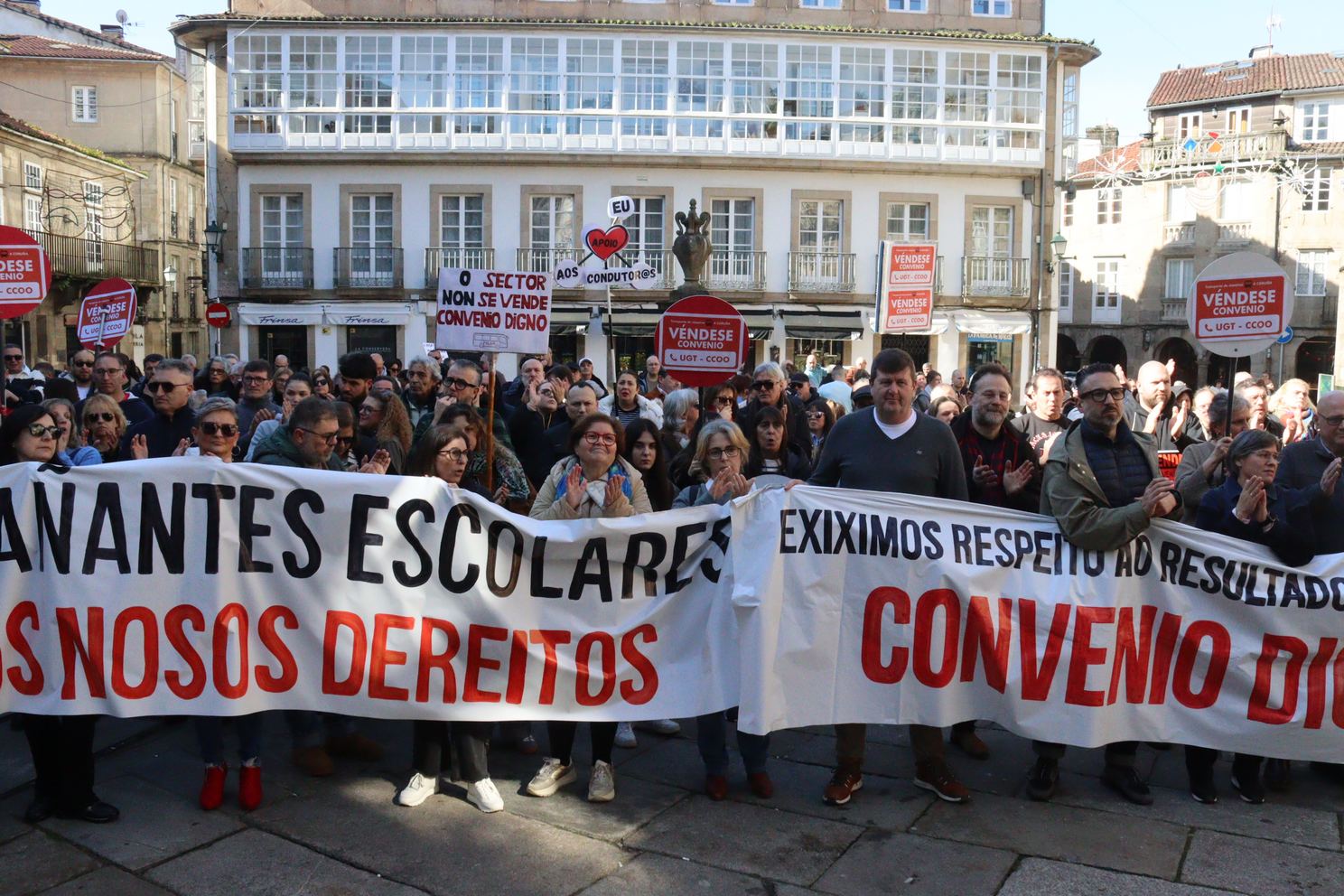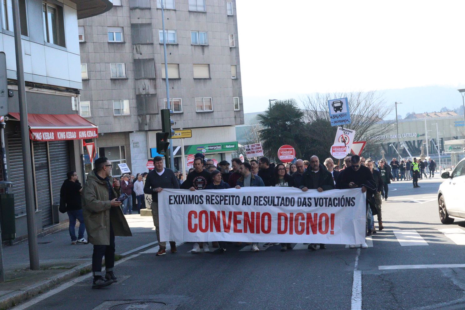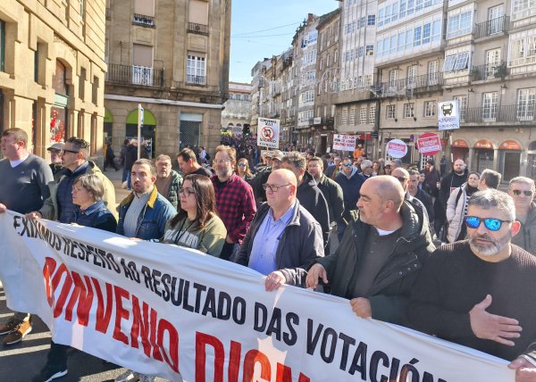 A manifestación, que partiu da estación intermodal de Santiago e rematou na Praza do Toural, estivo encabezada por unha faixa cunha mensaxe clara dirixida á patronal e aos sindicatos estatais: “exiximos respecto ao resultado das votacións, convenio digno”, en referencia ao rotundo rexeitamento do acordo asinado no marco da mediación, que recibiu a oposición de 831 persoas traballadoras no referendo celebrado o 4 de febreiro. Un referendo que, hai que salientar, era vinculante para todas as partes.