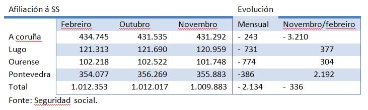 Mentres na media estatal aumentou o número de persoas afiliadas á Seguridade Social, en Galiza descendeu un 0,2%: 2.134 persoas afiliadas menos. A nivel provincial, caeu a afiliación en todas as provincias.