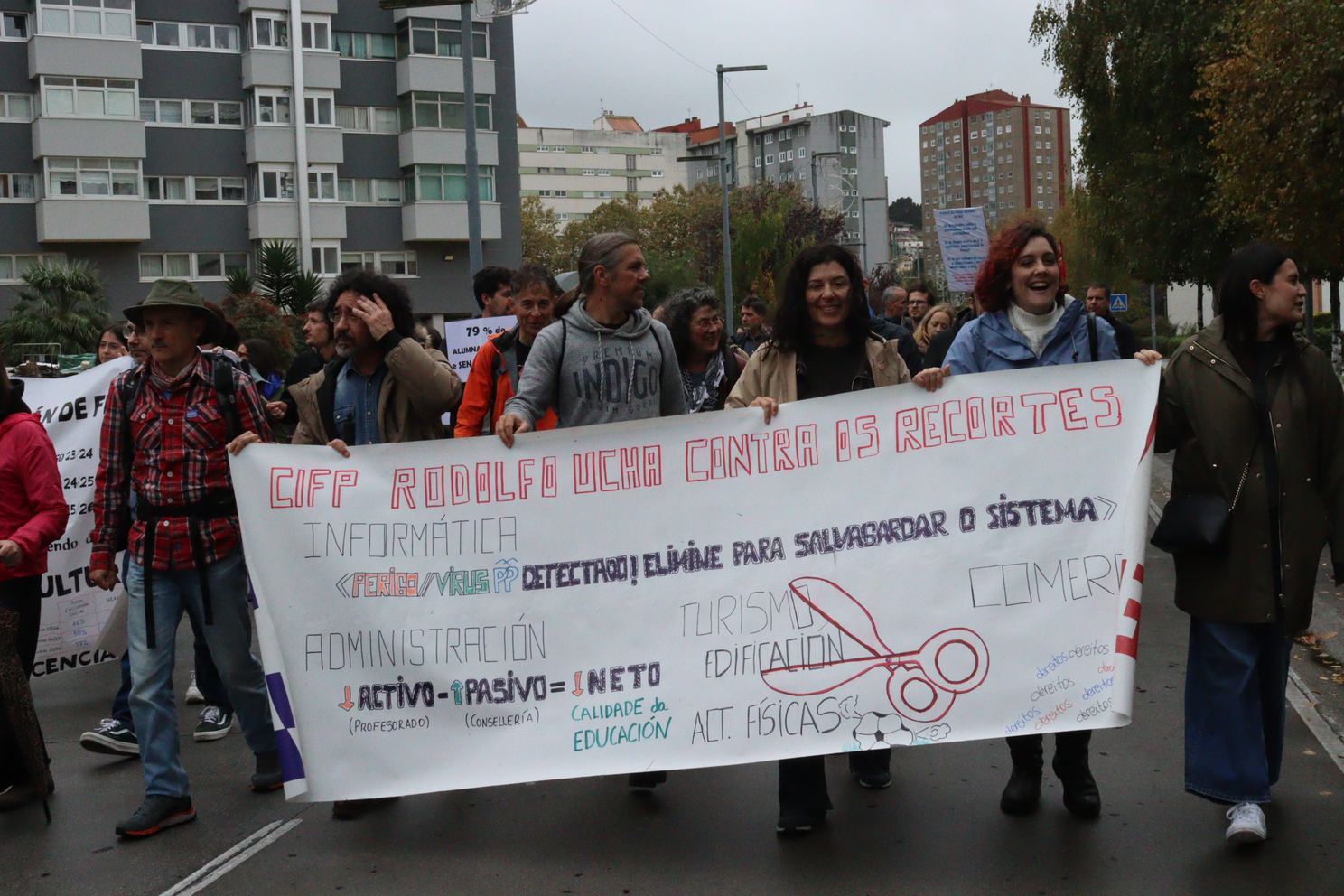Na Coruña, as persoas manifestantes saíron ás 11:30 horas do Colexio Alborada, onde esta noite se pecharon un grupo de 40 docentes, e marcharon até o edificio administrativo da Xunta en Monelos. A encargada de ler o manifesto final por parte da CIG-Ensino, Xela Armas, recalcou que “o profesorado galego está facendo historia con esta loita iniciada a comezos de curso despois de 15 anos de recortes nos que todas as enerxías e a responsabilidade profesional se volcaron en atender o alumnado".