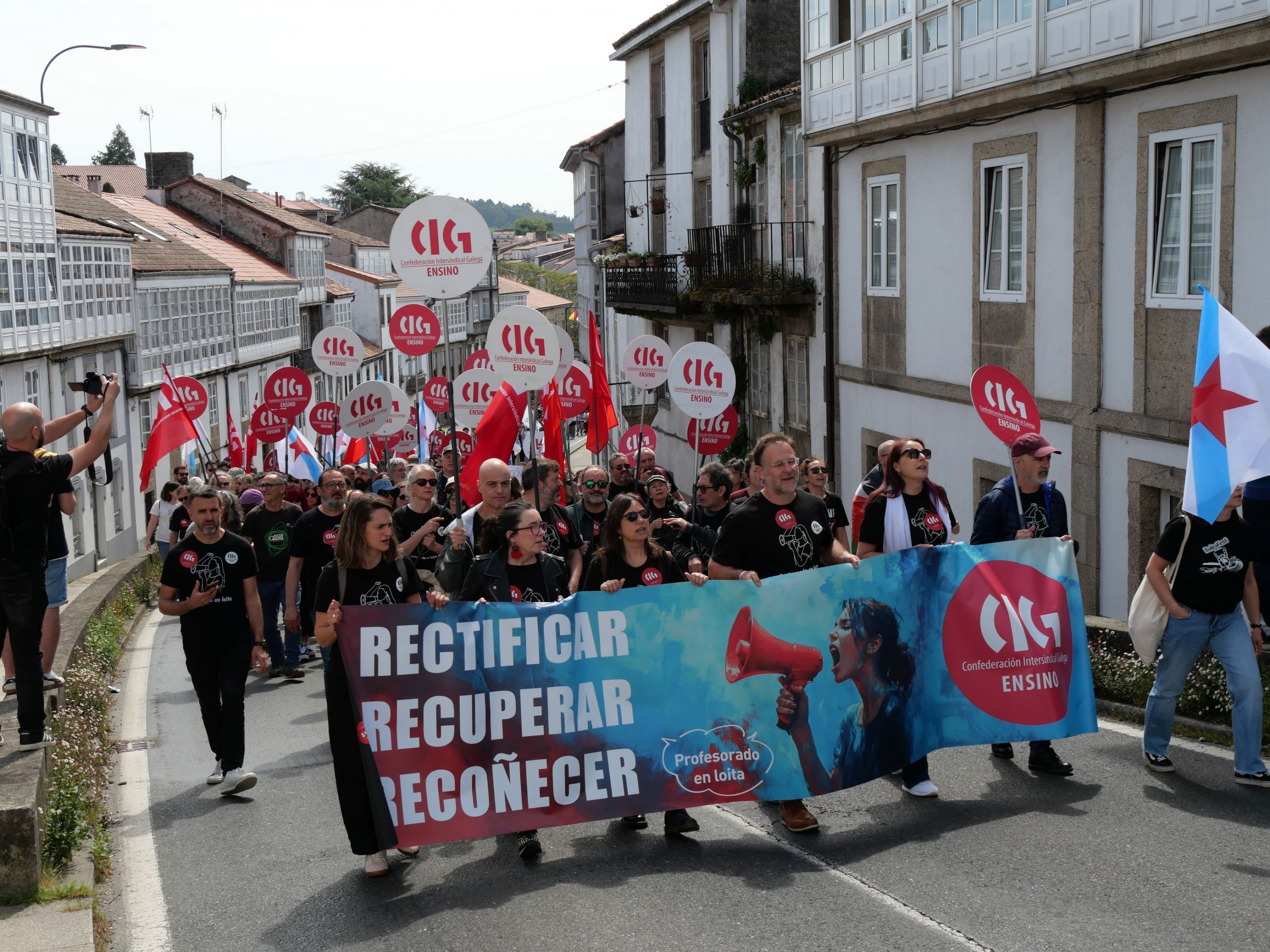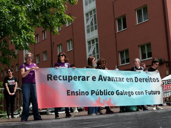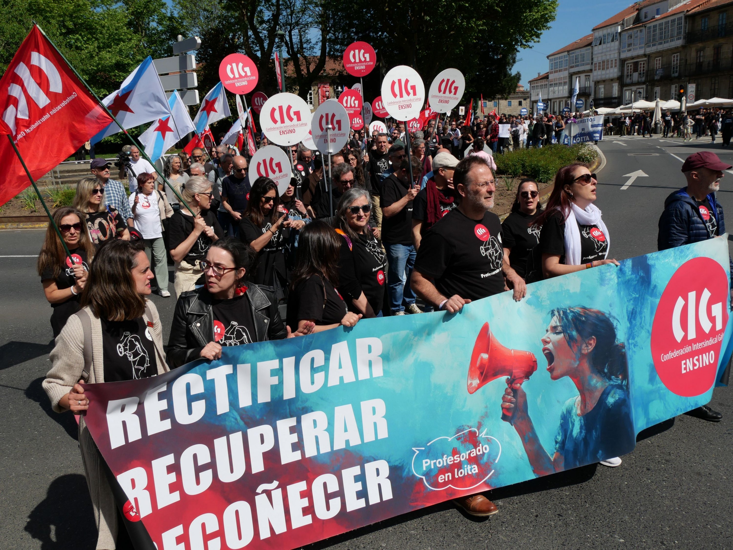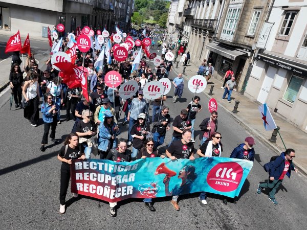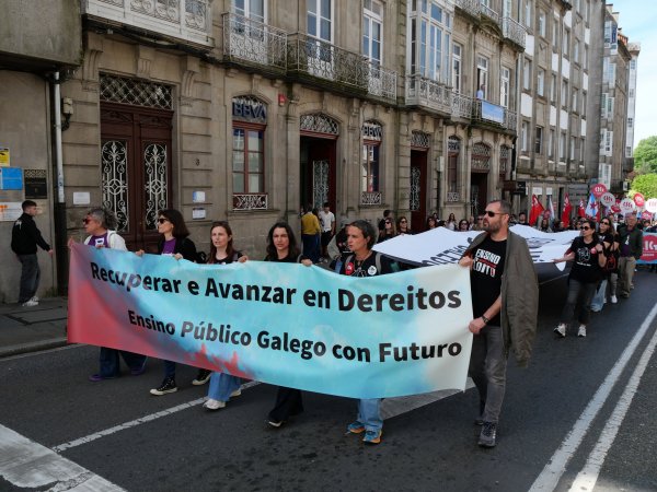 "Estamos fartas de fotos e de propaganda por parte da Consellaría de Educación e mais do sindicatos que asinan ese acordos de vergoña. Queremos melloras reais e concretas e que comecen a aplicarse xa o curso que vén". A secretaria nacional da CIG-Ensino, Laura Arroxo, realizaba estas declaracións ao inicio da manifestación que, baixo o lema “recuperar e avanzar en dereitos”, este martes reuniu a máis de 5.000 persoas na capital galega, maioritariamente docentes, pero tamén alumnado e familias.