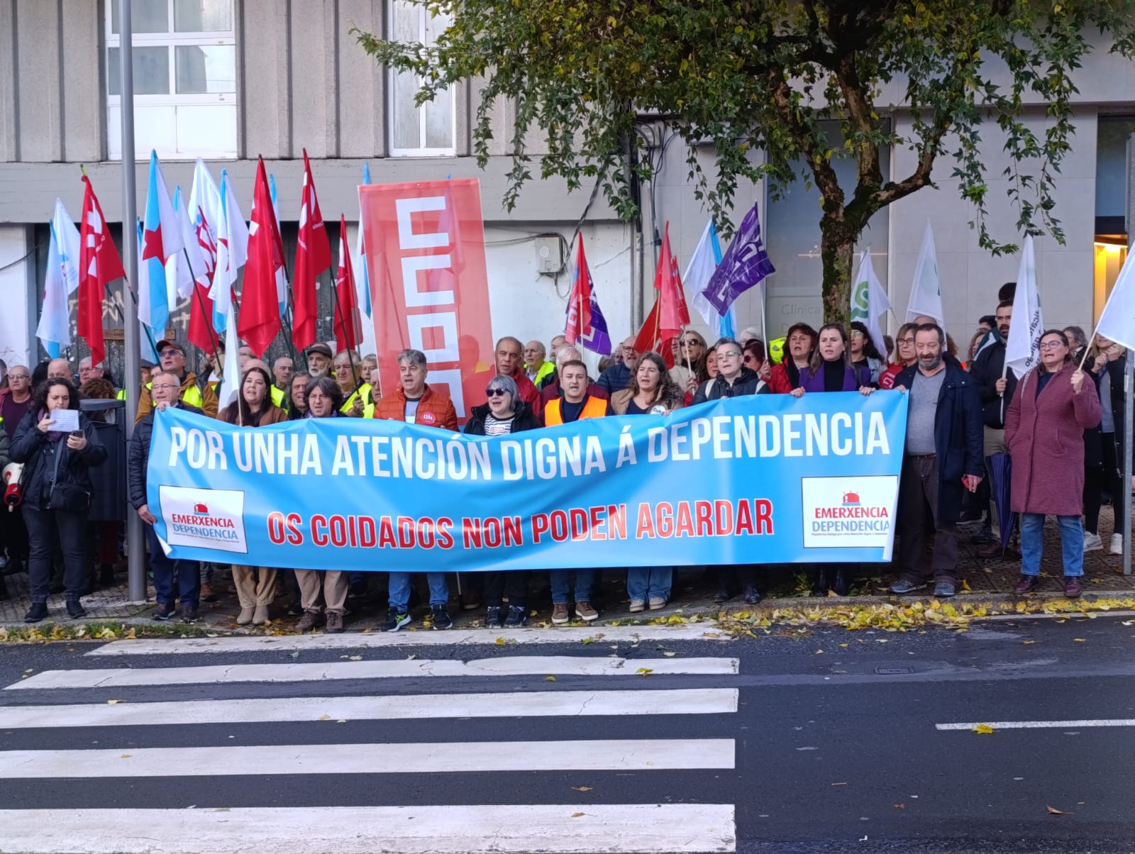 Na protesta lembrouse que, a día de hoxe, as persoas dependentes deben agardar de media ao redor dun ano para recibir unha prestación que, segundo a lei, debería resolverse en 180 días, e moitas persoas falecen mentres esperan pola dependencia. Galiza é a comunidade autónoma con menor número de solicitudes de dependencia por persoa potencialmente dependente, segundo os datos que publica o IMSERSO sobre o Sistema para la Autonomía y Atención a la Dependencia (SAAD).