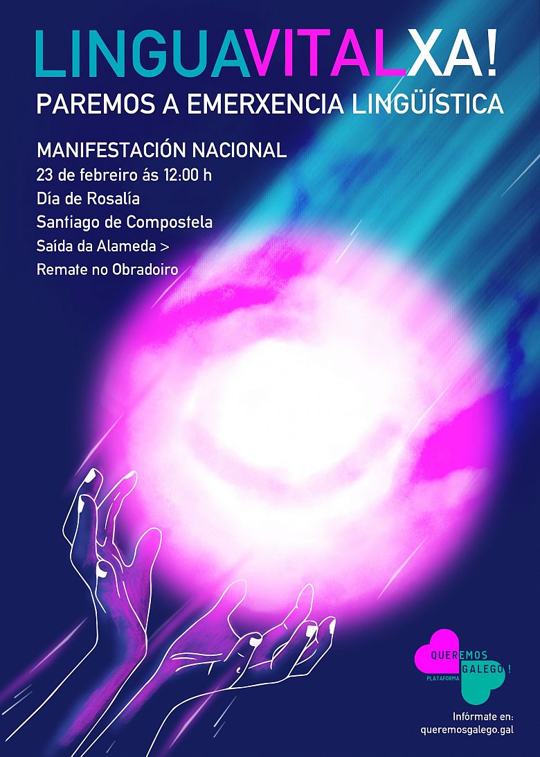 Queremos Galego presentou esta mañá en rolda de prensa a manifestación que sairá da Alameda de Santiago de Compostela, o 23 de febreiro ás 12h, e rematará na Praza do Obradoiro, onde está previsto celebrar unha actuación musical. O día de Rosalía, a plataforma de defensa da nosa lingua anima a cidadanía a transformar a emerxencia lingüística en forza reparadora, reclamando Lingua vital xa!