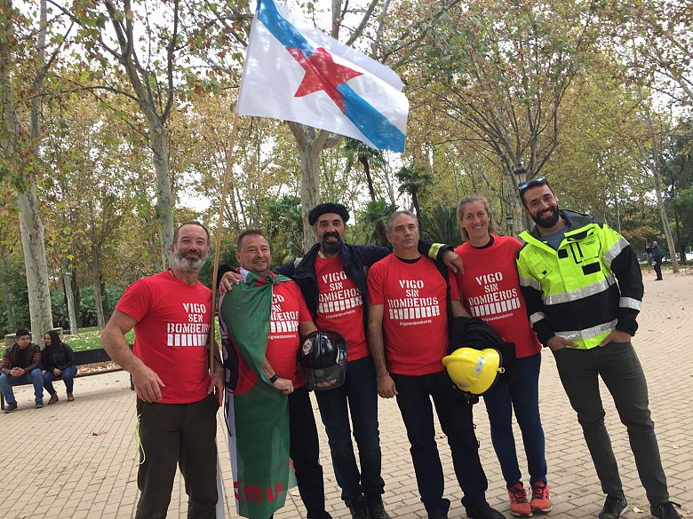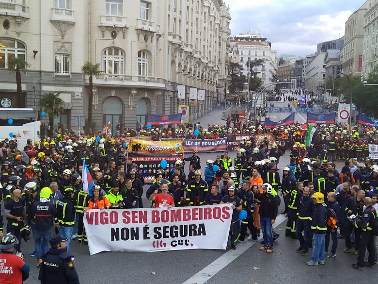 Miguel Uclés é delegado da CIG no servizo de bombeiros do Concello de Vigo e presidente da Plataforma de Bombeiros Públicos de Galiza. Este sábado participou, xunto a outros compañeiros/as galegos/as, na mobilización convocada en Madrid pola Coordinadora Unitaria de Bomberos Profesionales para reclamar unha lei marco estatal que regule a todos/as os bombeiros/as do Estado, pero sen invadir competencias autonómicas nin limitar a autonomía local.
