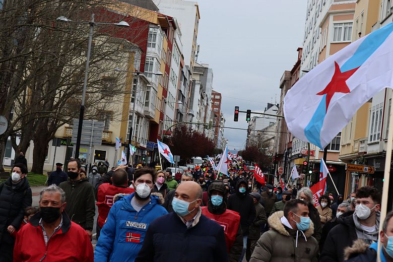 "Estas comarcas necesitan que esta folga sexa un éxito", salientaba o secretario da CIG de Ferrol, Manuel Anxo Grandal, pouco antes de arrancar a manifestación na que participaron milleiros de persoas en demanda de "políticas e investimentos que nos permitan ter futuro". Unha marcha que discorreu por toda a estrada de Castela até a Porta Nova e que recibiu o apoio de traballadores e traballadoras de grandes industriais que tamén están en loita, como Alcoa San Cibrao, Alu Ibérica da Coruña, Ferroatlántica ou Celsa Atlantic, evidenciando deste xeito a grave crise industrial que atravesa Galiza.